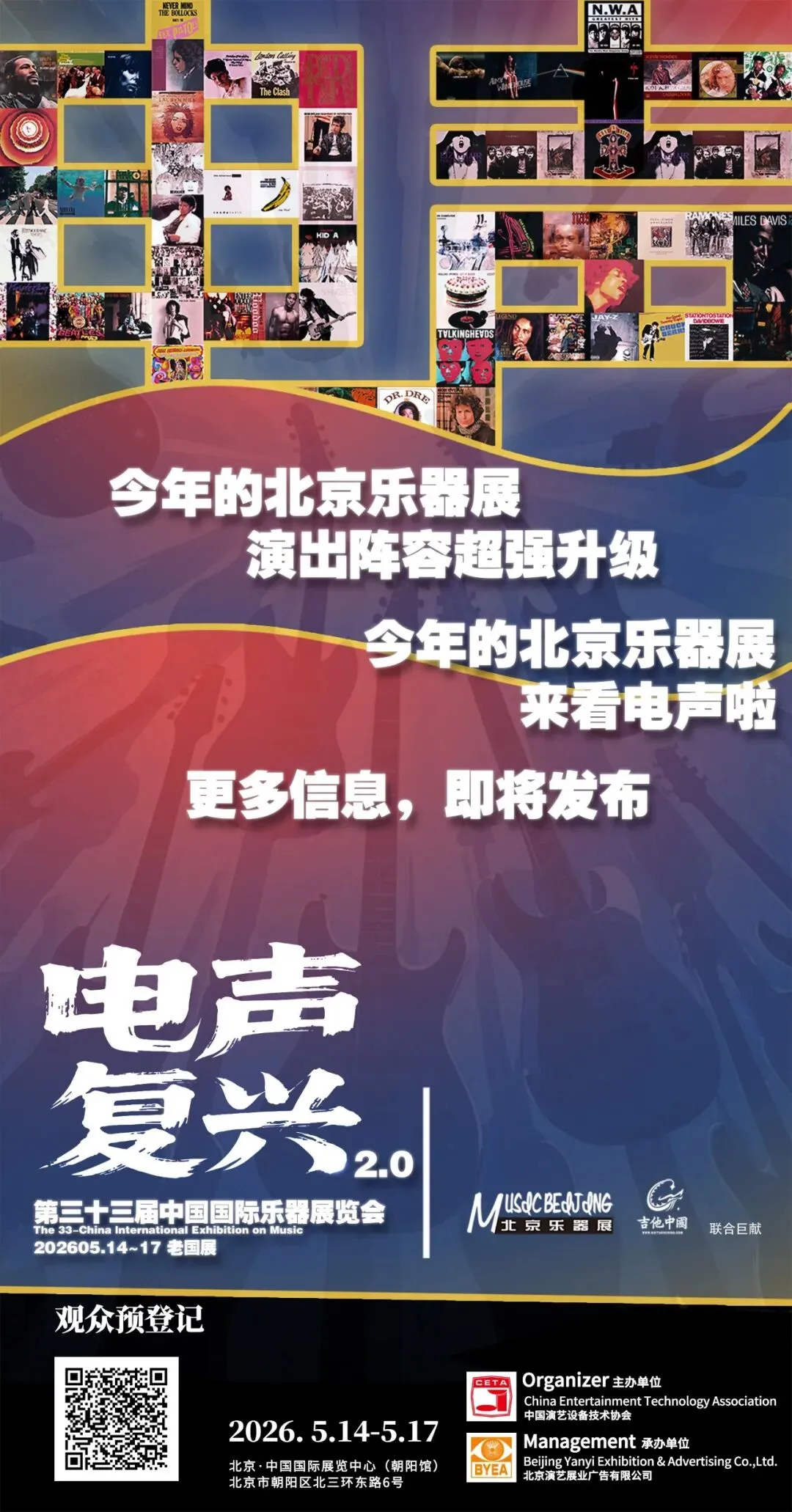 2026第三十三届中国国际乐器展览会(北京国际乐器展)将于2026年5月14-17日在北京老国展继续举行,2026依然主打电声,展会继续与吉他中国合作,推出3号馆为电声馆,并开辟2号馆单独场馆为厂商提供展演超大舞台,并由吉他中国整体运营制作,今年乐队阵容更加强大,2026年主题为:电声复兴2.0!
