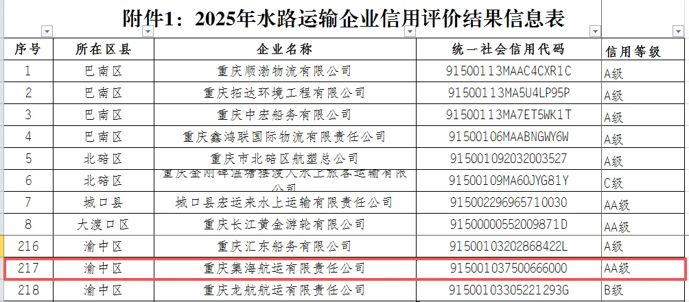 近日,重庆市交通委员会正式发布了2025年度重庆市水上交通行业信用评价结果。重庆集海航运有限责任公司成功获评“市水上交通行业AA级信用等级”。