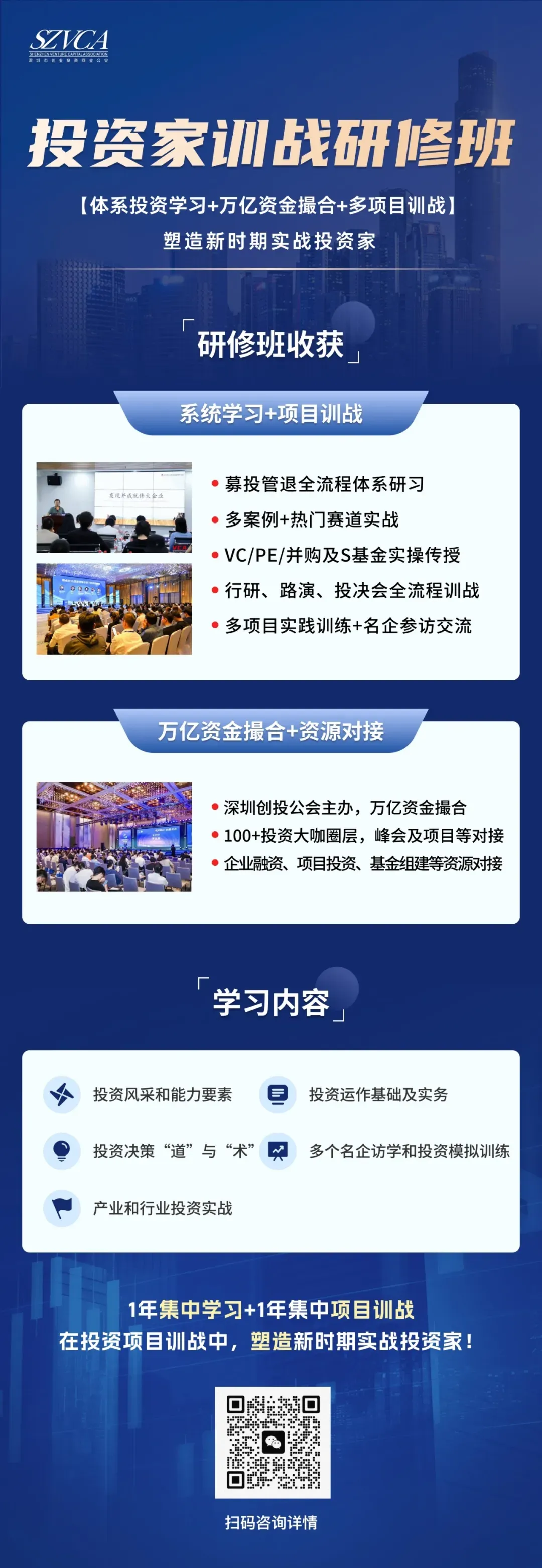 为此,我们特别推出【投资家训战研修班】,由资深FA、头部基金合伙人、产业专家亲自授课,带你拆解像量旋科技这样的标杆案例,掌握从尽调到估值的全套方法论。课程包含实地参访、项目路演、内部培训等深度环节。