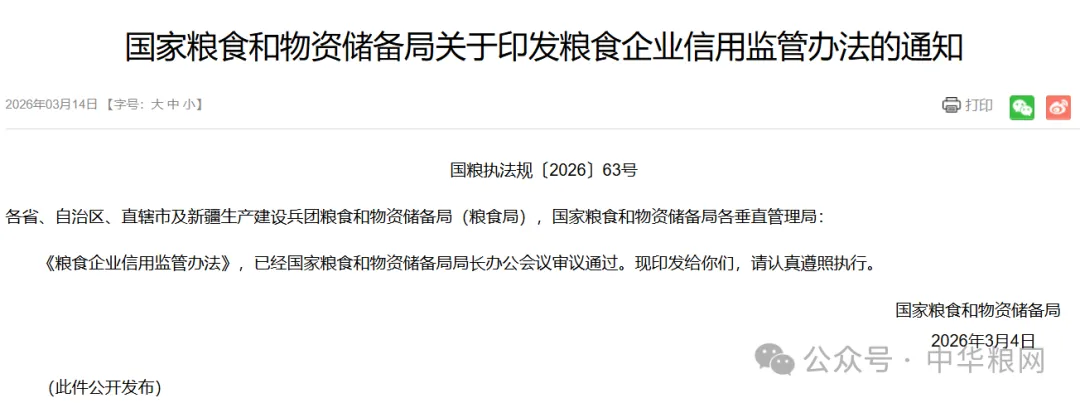 据国家粮食和物资储备局消息,国家粮食和物资储备局近日正式印发《粮食企业信用监管办法》,旨在规范粮食企业信用监管活动,促进企业守法经营和诚信自律。该办法自印发之日起施行,有效期5年。