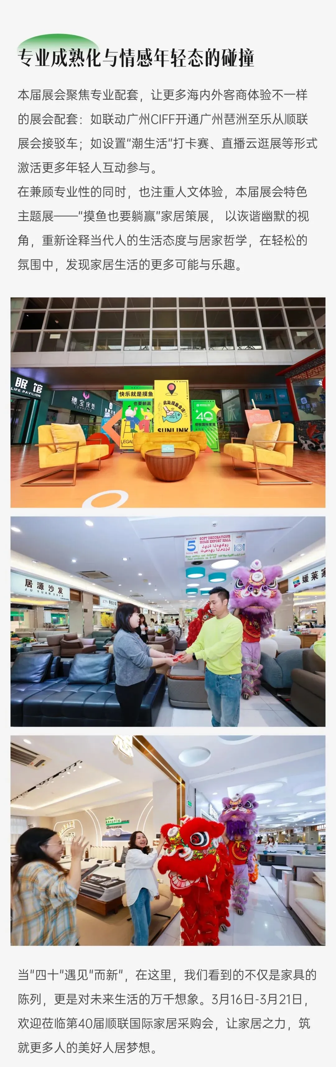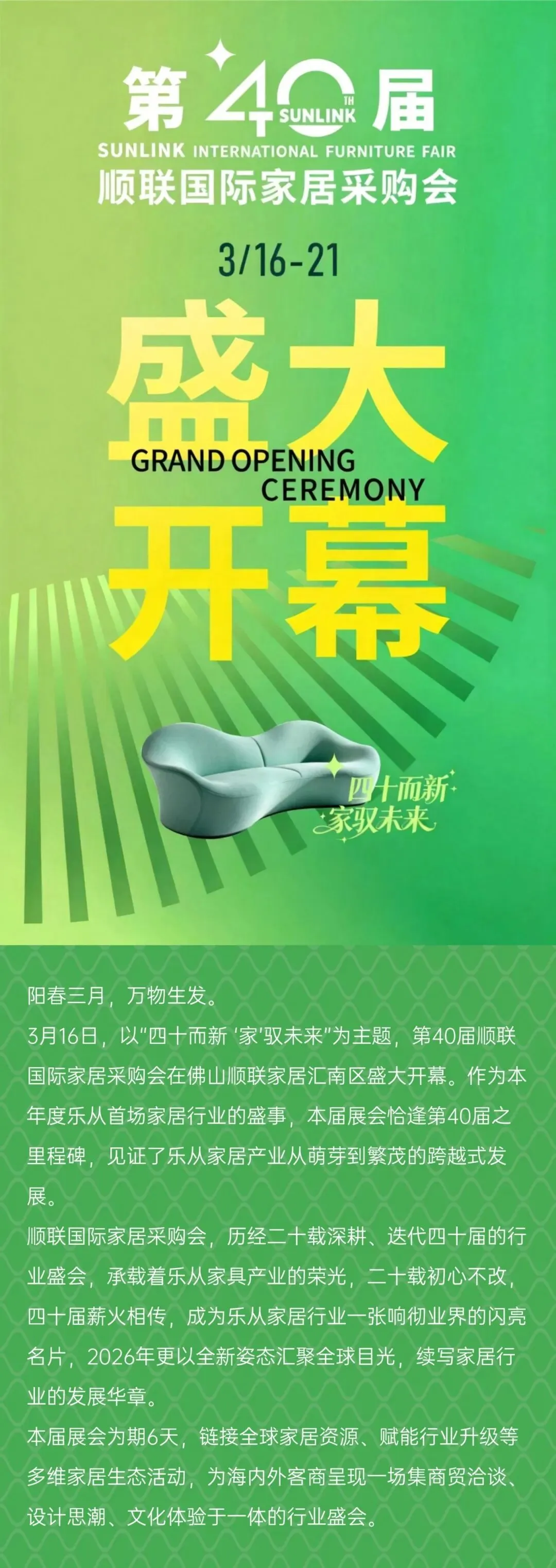 3月14日至31日,顺联家居汇·北区携手广东省家具协会,联合呈现2026顺联春季国际家具展暨“华笔奖”展。同期,2026年广东省家具行业设计年会暨“华笔奖”颁奖典礼及作品展览在佛山乐从顺联家居汇·北区隆重举行,形成“展+会”联动、设计与产业共振的盛况。
