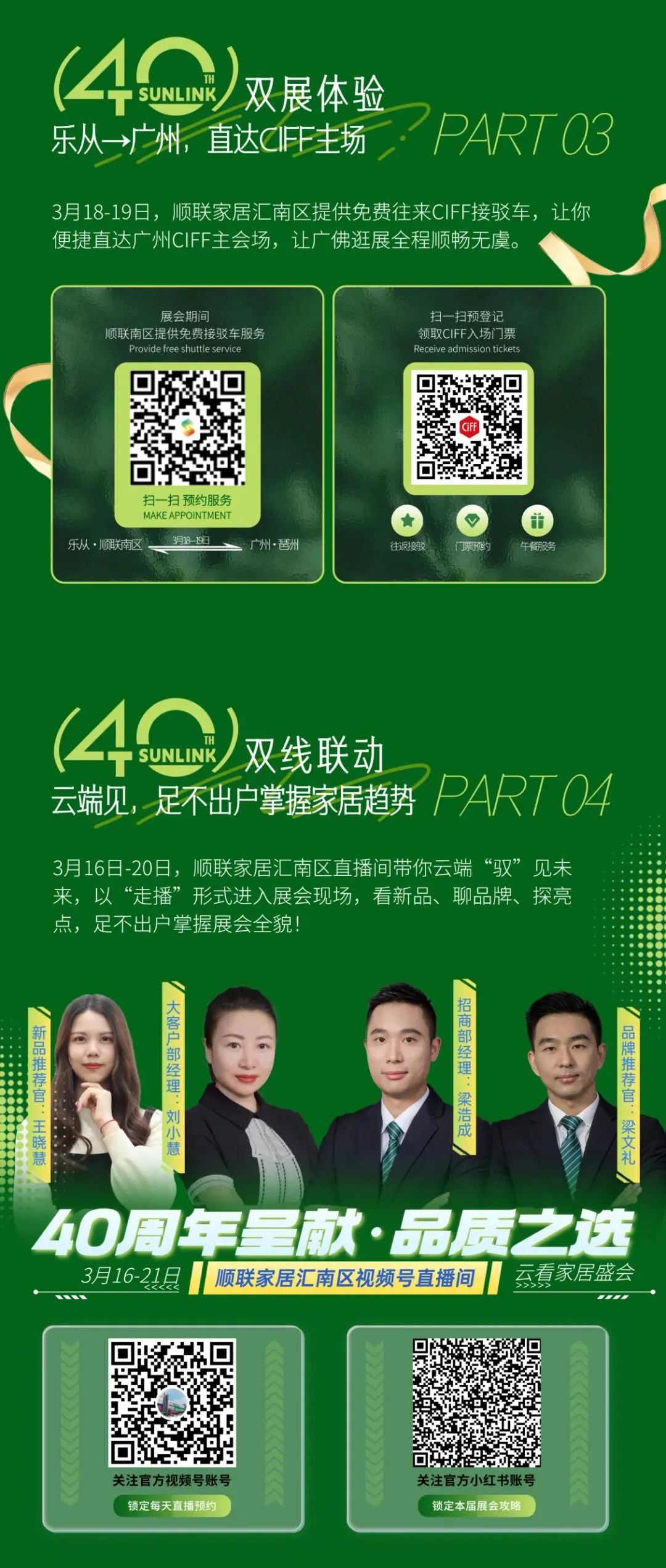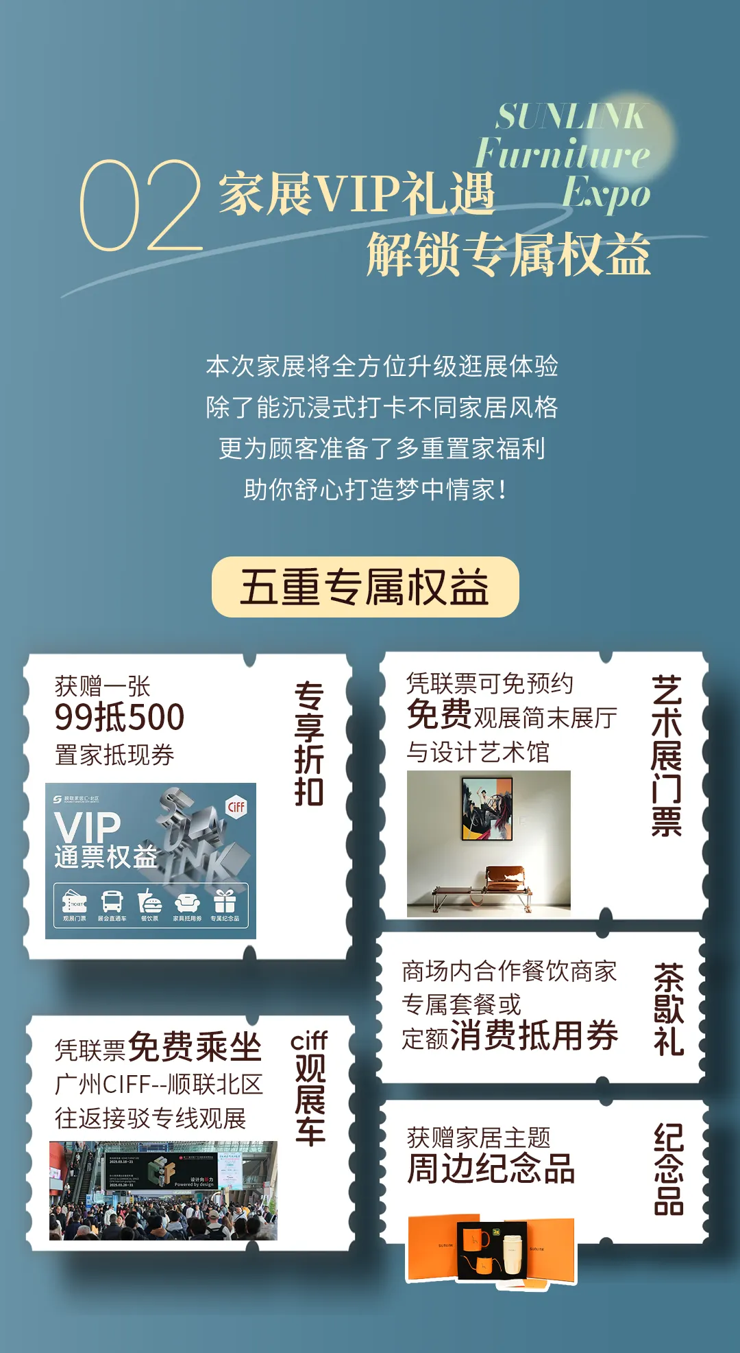 展会期间,顺联家居汇·北区官方抖音、小红书及视频号同步开启直播,带领15万+线上观众“云逛展”。抖音本地生活平台同步推出家展VIP权益券,涵盖500元家具现金抵用券、广州CIFF展门票、顺联当代艺术家居设计馆门票、主题纪念品、餐饮茶歇等多重福利,提升逛展体验。