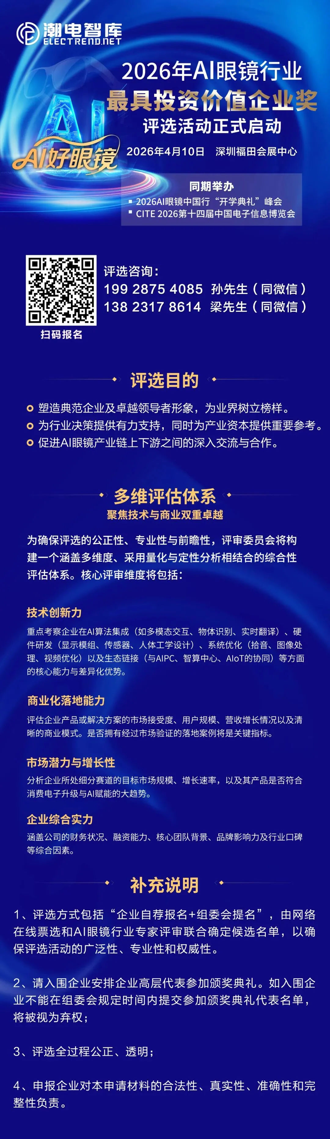 为精准识别并表彰在这一高增长赛道中具备卓越潜力与引领价值的企业,推动产业健康有序发展,2026年AI眼镜行业“最具投资价值企业奖”评选活动正式启动。