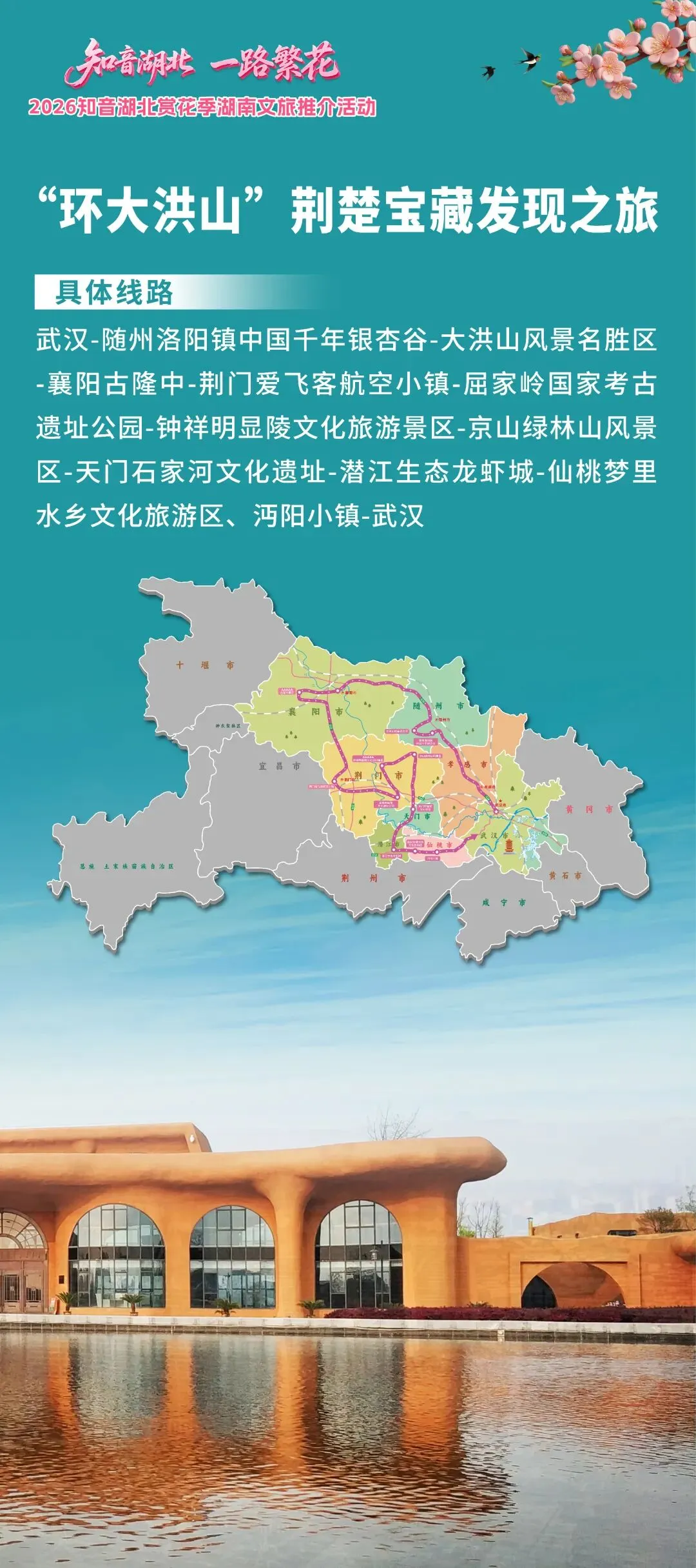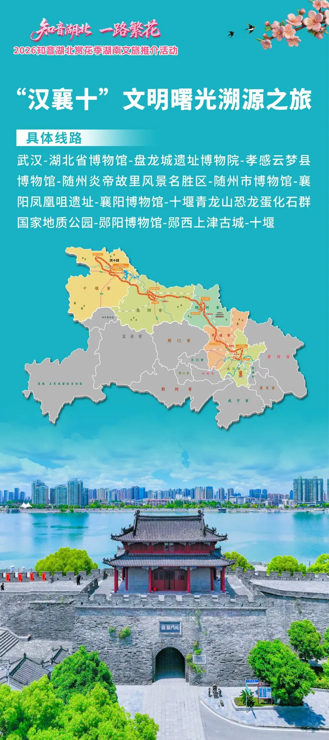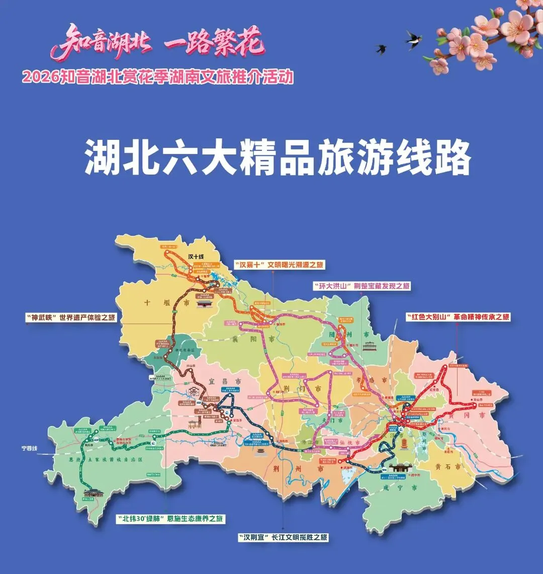 不止单点惊艳,襄阳更深度融入湖北六大精品旅游线路,两大核心线路贯穿襄阳,串联起自然山水与千年文脉,为湖南游客量身打造沉浸式春日之旅。