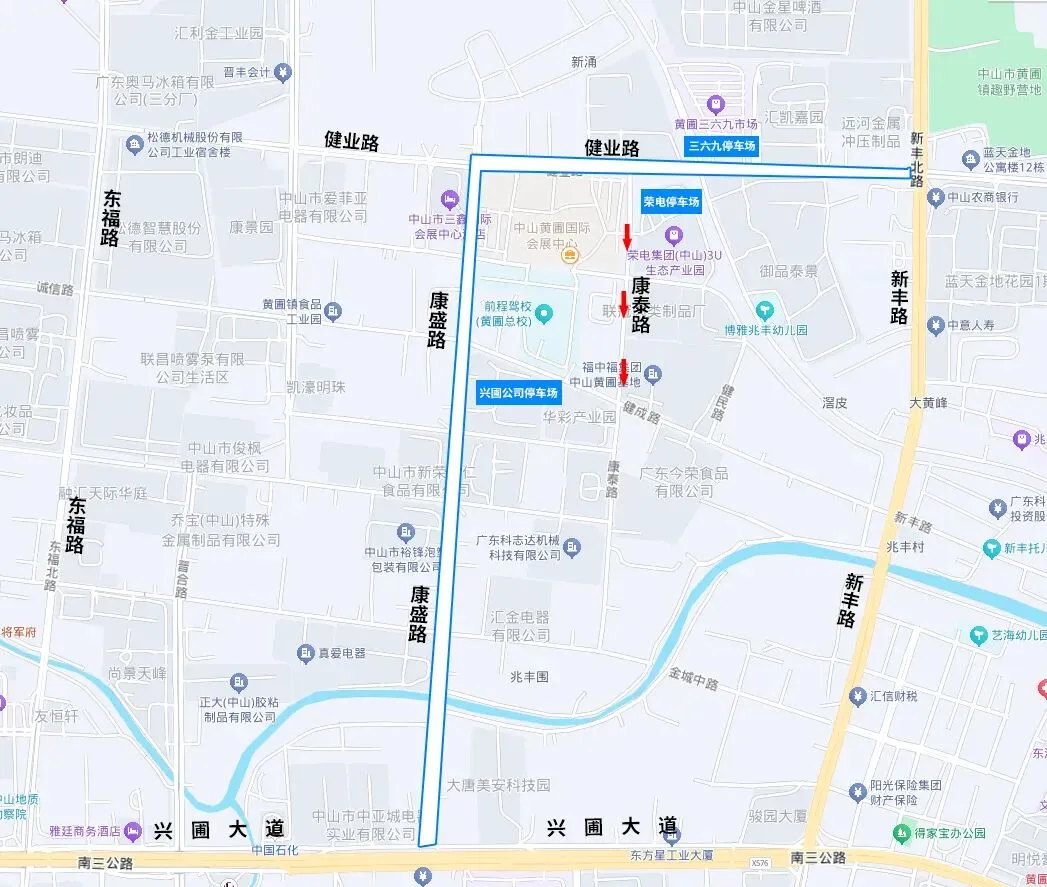 1、康盛路、健业路(蓝色框选路段)限制大型车辆驶入;