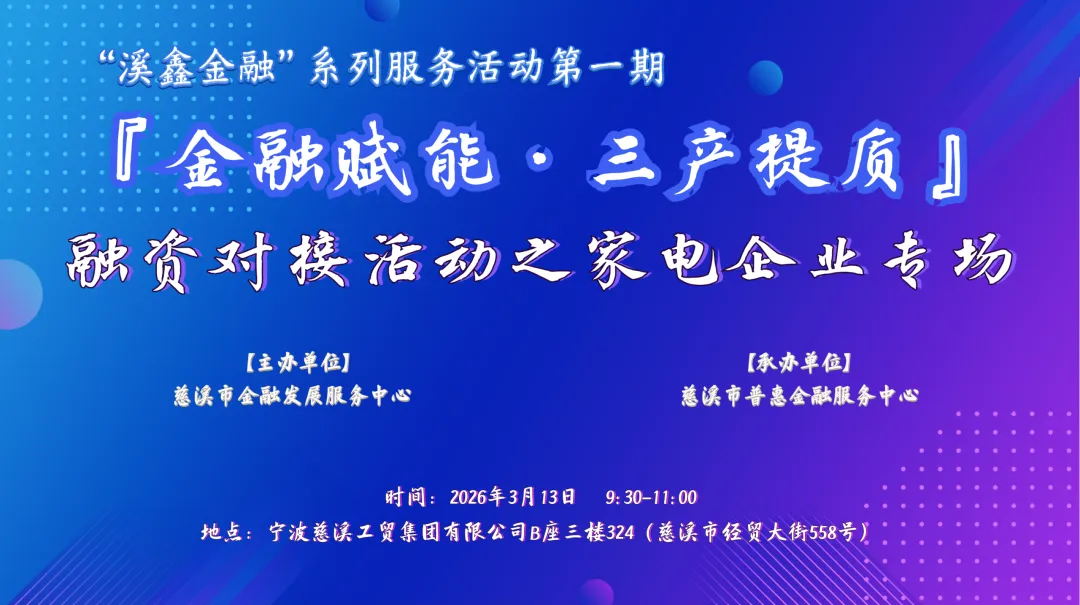 为进一步发挥金融对实体经济的赋能作用,精准服务家电企业转型升级与渠道拓展等融资需求,3月13日上午,由慈溪市金融发展服务中心主办、慈溪市普惠金融服务中心承办的“金融赋能·三产提质”系列融资对接活动之家电企业专场暨“溪鑫金融”系列服务活动第一期成功举办。