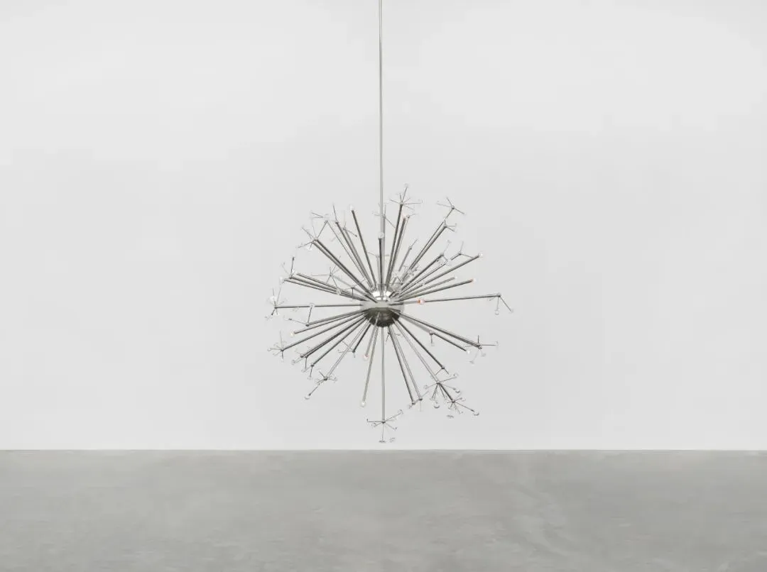 Josiah McElhenyLate Emergence III2026Super mirror polished stainless steel, hand-blown and moulded glass, electric lighting and rigging 198.1 cm | Ø 78 in.© Josiah McElheny.