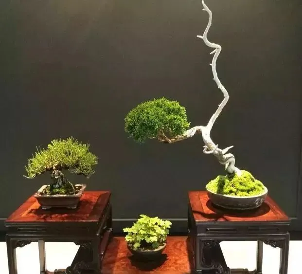 其实欣赏盆景,仔细观察和听讲解,就会发现,即使是出自名师之手制作的盆景,都有一定的规律,那就是先粗后细,先大后小顺序来欣赏。大师们就会根据它们的的特点来进行装饰,这个装饰是非常重要的,我们不要以为重点都在这个盆景中的植物上,其实画龙点睛之处还是需要盆景的设计和包装,例如树配盆、配几的大小,式样,质地和颜色等,最后看其 铺苔,置石,饰物等。才能让整个盆景看上去更加的独特和一番韵味。只要能做到对比能调和,变化能统一,平凡中带着独特,在起一个独特的名字和这个盆景相配,就大功告成啦~