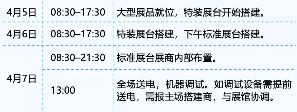 注:布展及撤展期间如需加班,请于当天14:30前在东登录大厅南侧展馆服务台申报,并支付相应加班费用(详细查阅展商手册或咨询分馆服务处)。14:30后逾时申报加班,不予受理。加班期间只提供电,不提供压缩空气。
