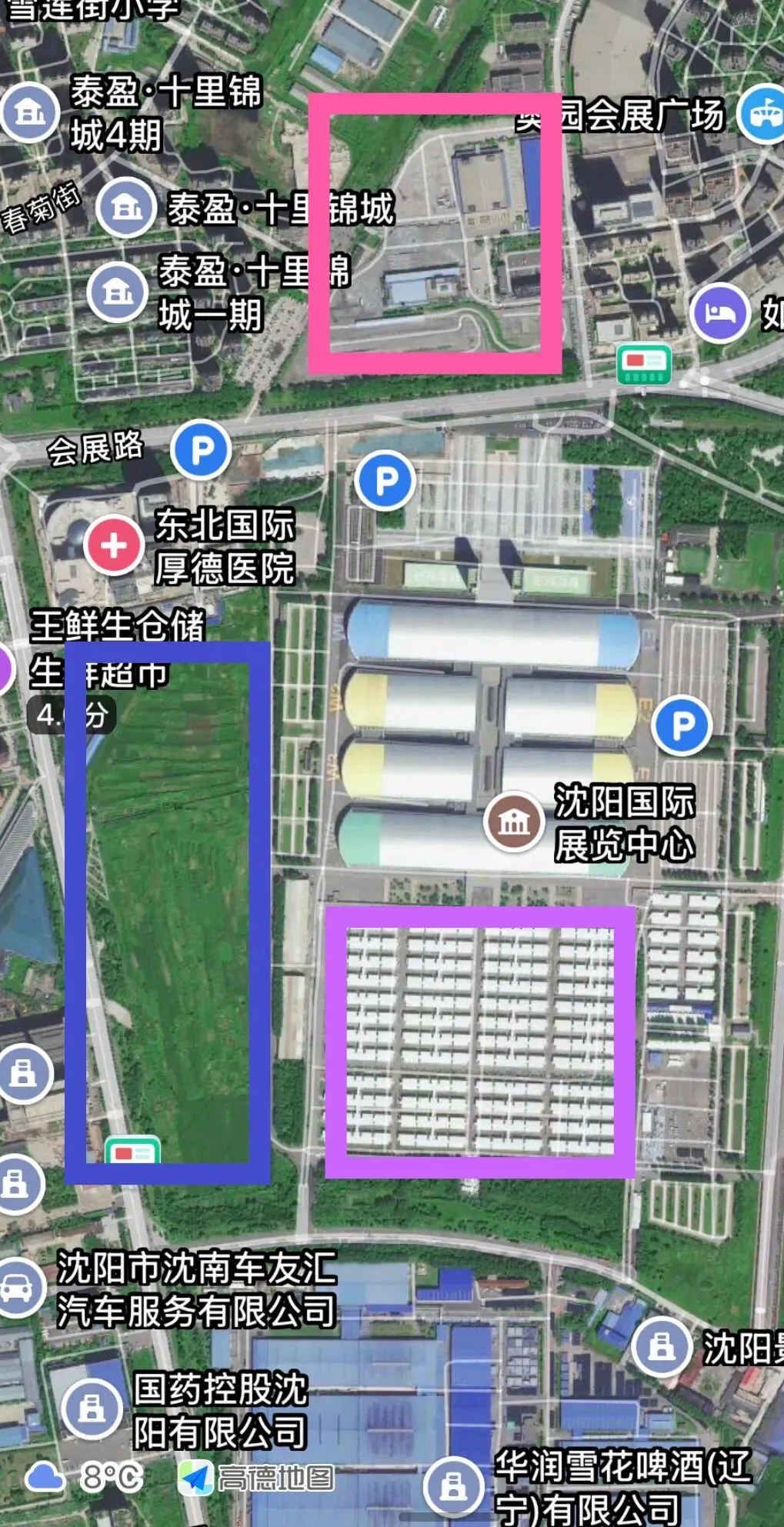 既然是会展二期,那就是会展中心附近,也就是下图的蓝框、紫框和粉框三处↓