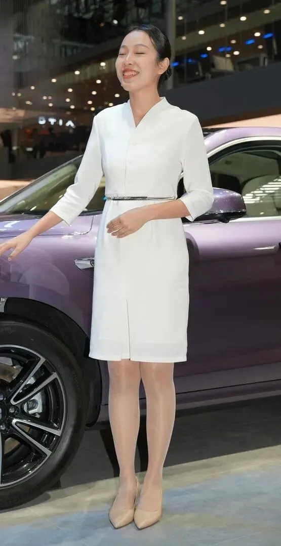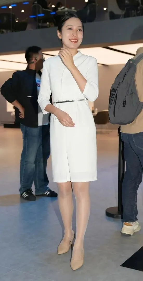 离开展车区域之后,在展厅一角伫立的姿势也是挺拔且庄重的。白色中长款连衣裙保持了简约的设计风格,立领、小V型开襟、七分袖,收在手腕上,腰部有黑皮带做腰线,很细的腰。双手自然交叉于小腹之上,两腿并拢,左腿微屈向前就是教科书里最常见的姿势,端庄有气质,气场强大。