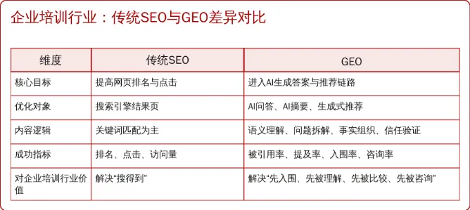 这意味着,企业培训行业正在从"谁的销售更勤快、谁的渠道更广",逐渐转向"谁更容易被AI理解、验证、引用和推荐,谁就更容易获得高质量培训咨询机会"。而这背后对应的,不只是传统SEO,而是GEO,即生成式引擎优化。