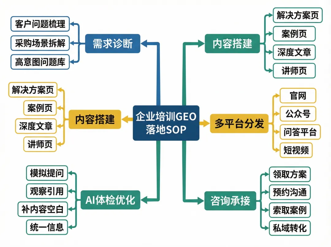 对企业培训来说,GEO从来不是单纯写文章,而是一条完整的"认知—比较—入围—咨询"转化链。