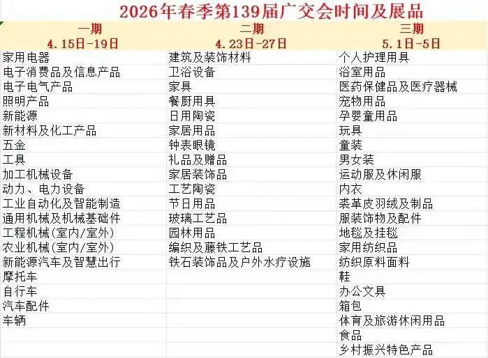 展会全称:第139届中国进出口商品交易会(春季广交会)2026年4月15日—19日(电子家电、车辆配件、机械五金、照明等)2026年4月23日—27日(日用消费品、礼品、家居饰品、建材等)2026年5月1日—5日(纺织服装、食品、医疗保健、办公休闲等)