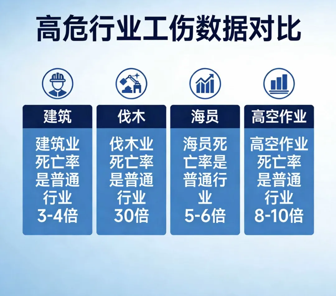 建筑业每年每10万人中约有10-15人死于工伤事故,是其他行业的3-4倍;伐木业的致命事故率是普通制造业的30倍;海员的海上死亡率是陆地工人的20多倍。