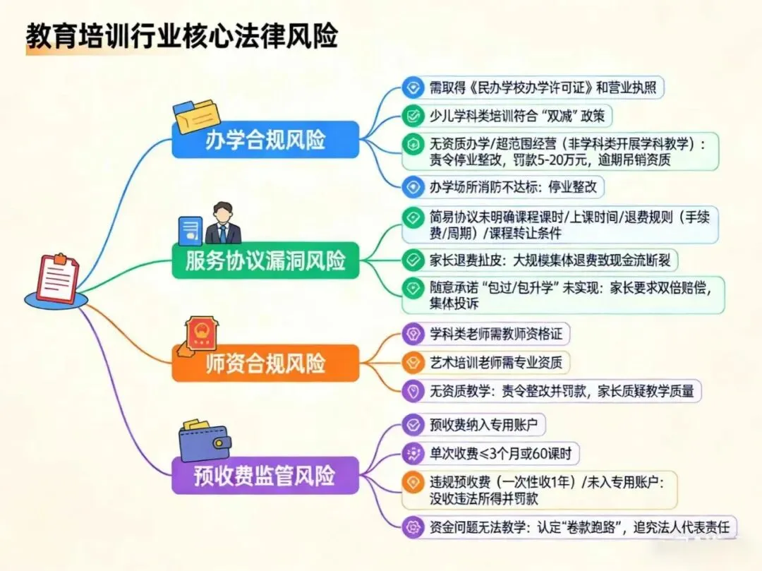 教育培训行业的核心法律风险与政策合规、家长权益直接挂钩,且监管处罚力度大:一是办学合规风险,这是行业最基础也是最致命的风险,校外培训机构需取得《民办学校办学许可证》和营业执照,少儿学科类培训还需符合“双减” 政策要求,无资质办学、超范围经营(如非学科类培训开展学科类教学),监管部门将责令停业整改,并处以 5-20 万元罚款,逾期未整改将吊销相关资质,直接失去办学资格;办学场所不符合安全标准(如消防不达标),也将面临停业整改,无法正常开展教学。二是服务协议漏洞风险,这是行业最常见风险,机构与家长签订的服务协议多为简易版本,未明确课程课时、上课时间、退费规则(如退费手续费、退费周期)、课程转让条件,家长因孩子没时间上课、教学效果不佳要求退费时,易引发扯皮,甚至出现大规模集体退费,机构现金流瞬间断裂;部分机构随意承诺 “包过、包升学”,未实现承诺时,家长会要求双倍赔偿,引发集体投诉。三是师资合规风险,教育培训行业对师资资质有明确要求,如学科类培训老师需取得教师资格证,艺术培训老师需取得相关专业资质,若从业人员无资质教学,监管部门将责令整改并罚款,同时家长对教学质量产生质疑,失去信任。四是预收费监管风险,国家对校外培训机构预收费有严格监管要求,如预收费需纳入专用账户、单次收费不得超过 3 个月或 60 课时,违规预收费(如一次性收取 1 年学费)、预收费未纳入专用账户,监管部门将没收违法所得并罚款,若机构因资金问题无法正常教学,还会被认定为 “卷款跑路”,追究法人代表法律责任。