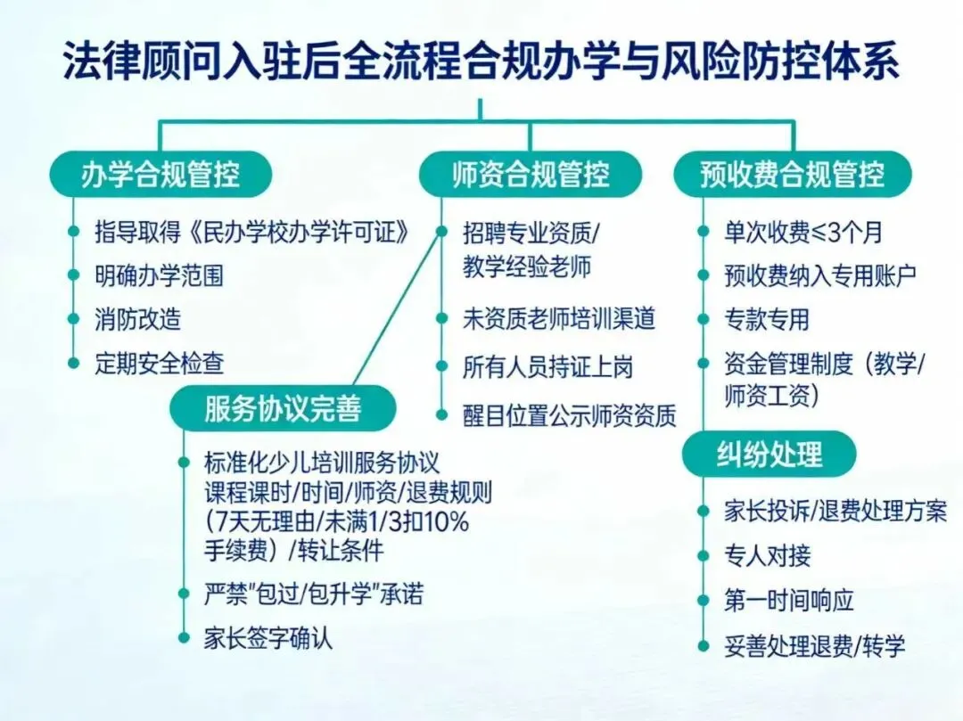 法律顾问入驻后,为机构搭建了全流程合规办学与风险防控体系:一是办学合规管控,指导机构按政策要求准备材料,顺利取得《民办学校办学许可证》,明确办学范围,严禁超范围经营;对办学场所进行消防改造,确保符合安全标准,定期开展安全检查。二是服务协议完善,制定标准化少儿培训服务协议,明确课程课时、上课时间、师资安排、退费规则(如7 天无理由退费、上课未满 1/3 退费扣除 10% 手续费)、课程转让条件,严禁随意承诺 “包过、包升学”,让家长签字确认,避免退费扯皮。三是师资合规管控,指导机构招聘有相关专业资质、教学经验的老师,为未取得资质的老师提供培训渠道,确保所有从业人员持证上岗;在机构醒目位置公示师资资质,让家长放心。四是预收费合规管控,严格按照国家规定收取预收费,单次收费不超过 3 个月,预收费全部纳入专用账户,专款专用,避免资金挪用;制定预收费资金管理制度,确保资金用于教学、师资工资等经营开支。五是纠纷处理,制定家长投诉、退费处理方案,安排专人负责对接,第一时间响应家长诉求,妥善处理退费、转学等问题,避免集体投诉。