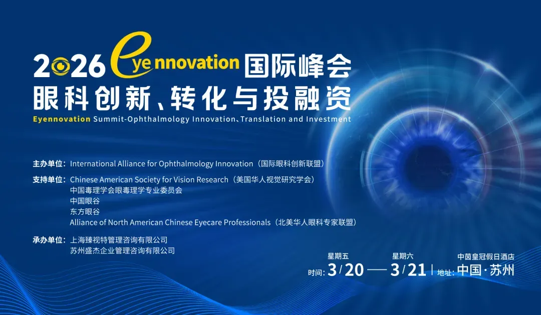 2026年03月20日-21日,2026 Eyennovation 国际眼科创新峰会将在苏州召开。大会秉承“以基础研究为源,以临床需求为向导,以产业转化为目标”的原则,以“推动创新、促进合作、塑造生态”为使命,推进全球眼科创新协同发展。本次峰会将汇聚全球领先的科学家、产业领袖、监管专家与投资人,围绕前沿技术趋势、临床未满足需求、全球市场与转化路径展开深度交流。通过高质量思想碰撞与精准项目对接,加速突破性眼科疗法的临床转化与全球商业落地,惠及全球患者。