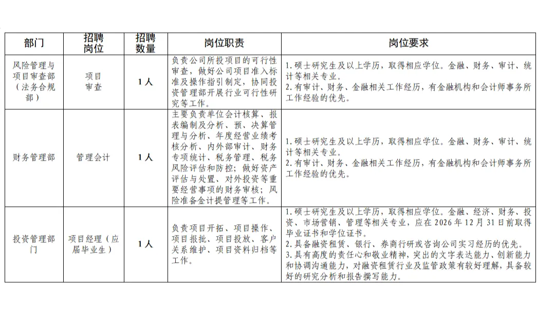 为进一步优化人才队伍结构,推动业务发展,浙江省富浙融资租赁有限公司部分职位面向社会公开招聘,现就有关招聘事宜公告如下: