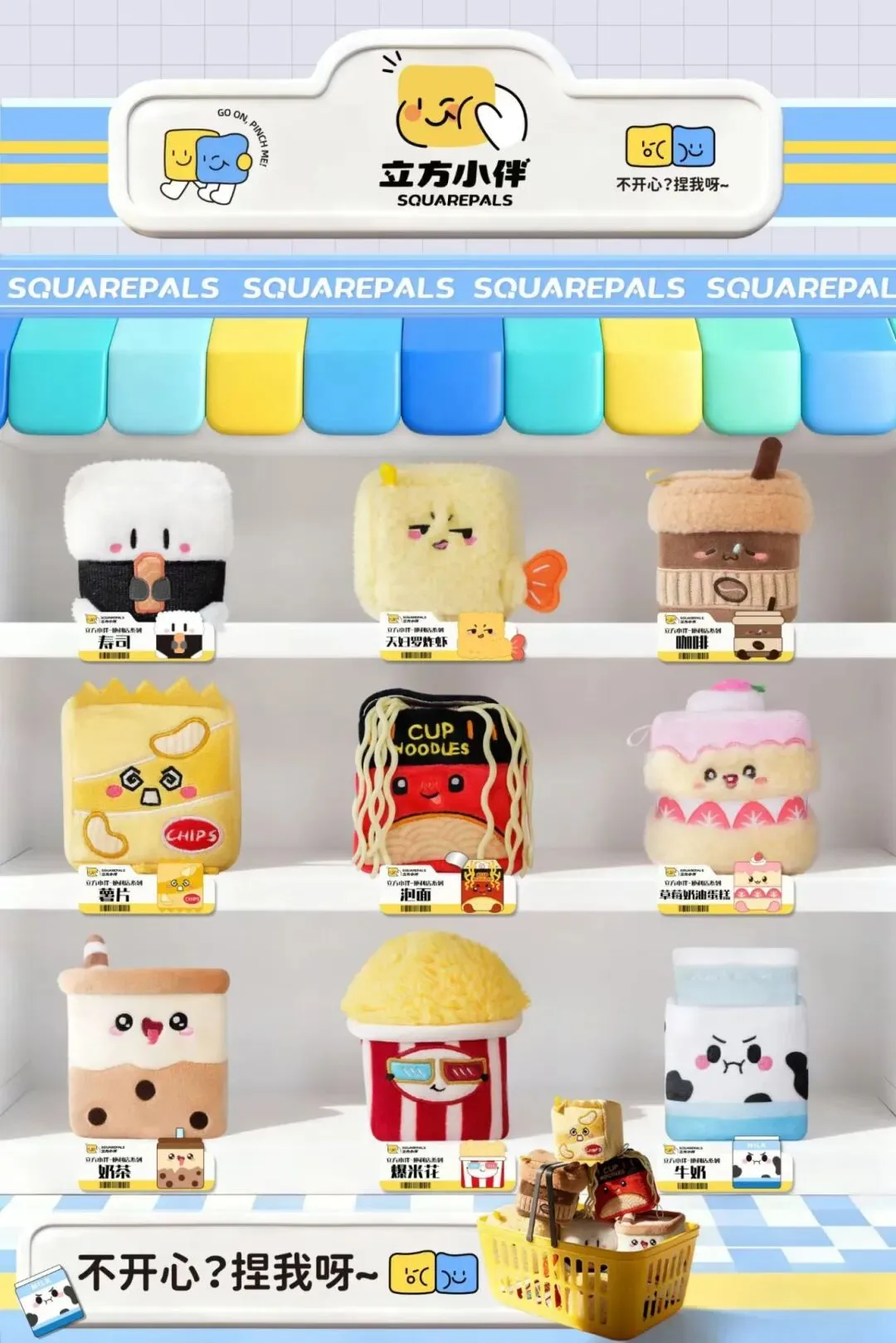 以便利店热门单品为原型,还原寿司、天妇罗、咖啡、泡面、草莓蛋糕、奶茶、爆米花、牛奶等9款经典形象。方形设计呆萌吸睛,细节刺绣生动传神。