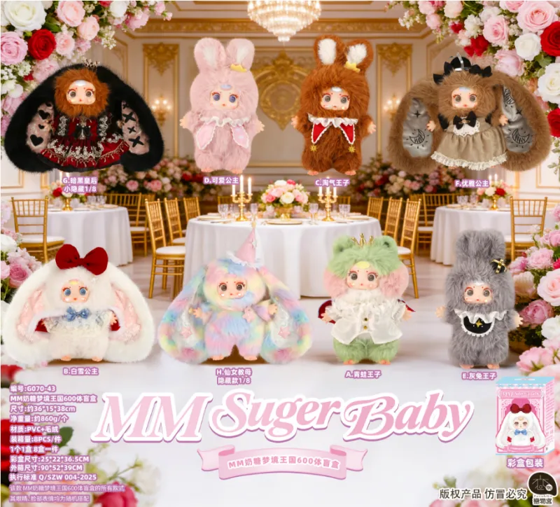 饱满大尺寸毛绒手感治愈,蕾丝、蝴蝶结等细节精致入微。每款拥有独特性格:优雅公主、俏皮王子、冷艳皇后,还有概率开出彩虹仙女教母隐藏款。