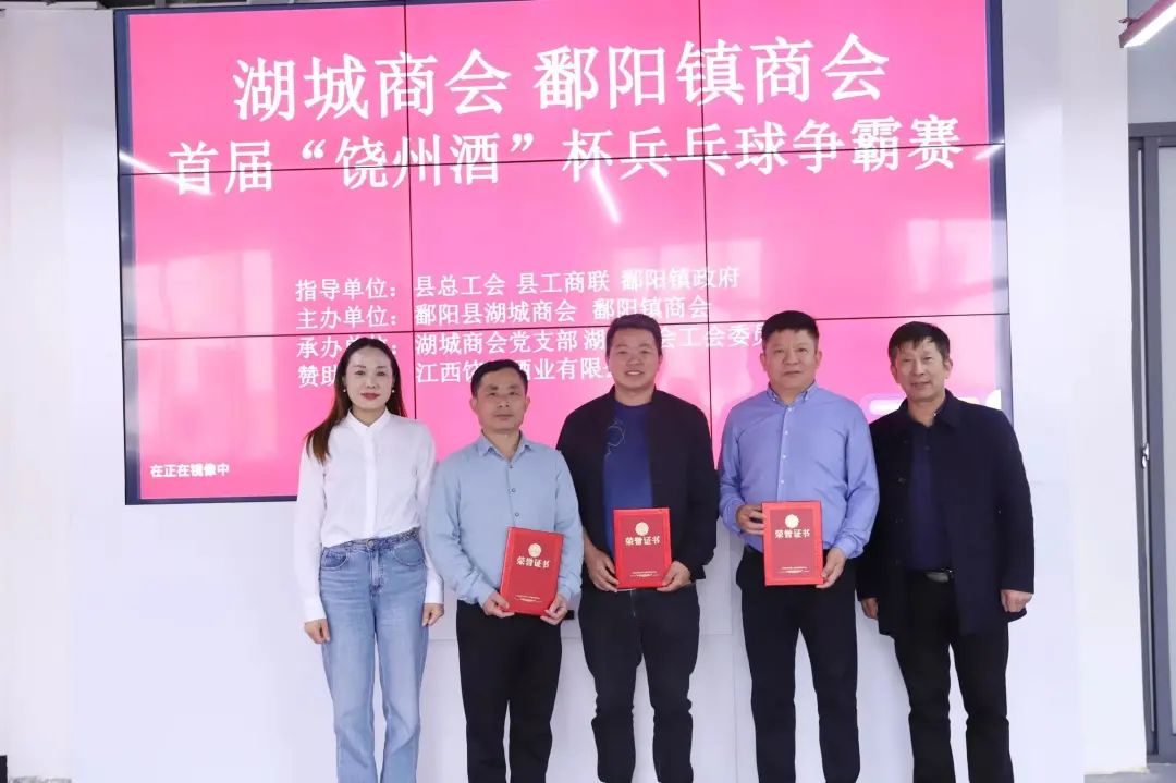 为欢度“五一”国际劳动节,进一步增强会员之间感情交流、凝聚力量,关心关爱会员身体健康、精神生活,4月28—29日,湖城商会、鄱阳镇商会,湖城商会党支部、湖城商会工会委员会联合举办首届“饶州酒业”杯乒乓球争霸赛。县人大常委会副主任、县总工会主席吴文艺出席活动并颁奖,县委统战部、县总工会、县工商联、鄱阳镇人民政府、等相关单位负责人等参加活动。