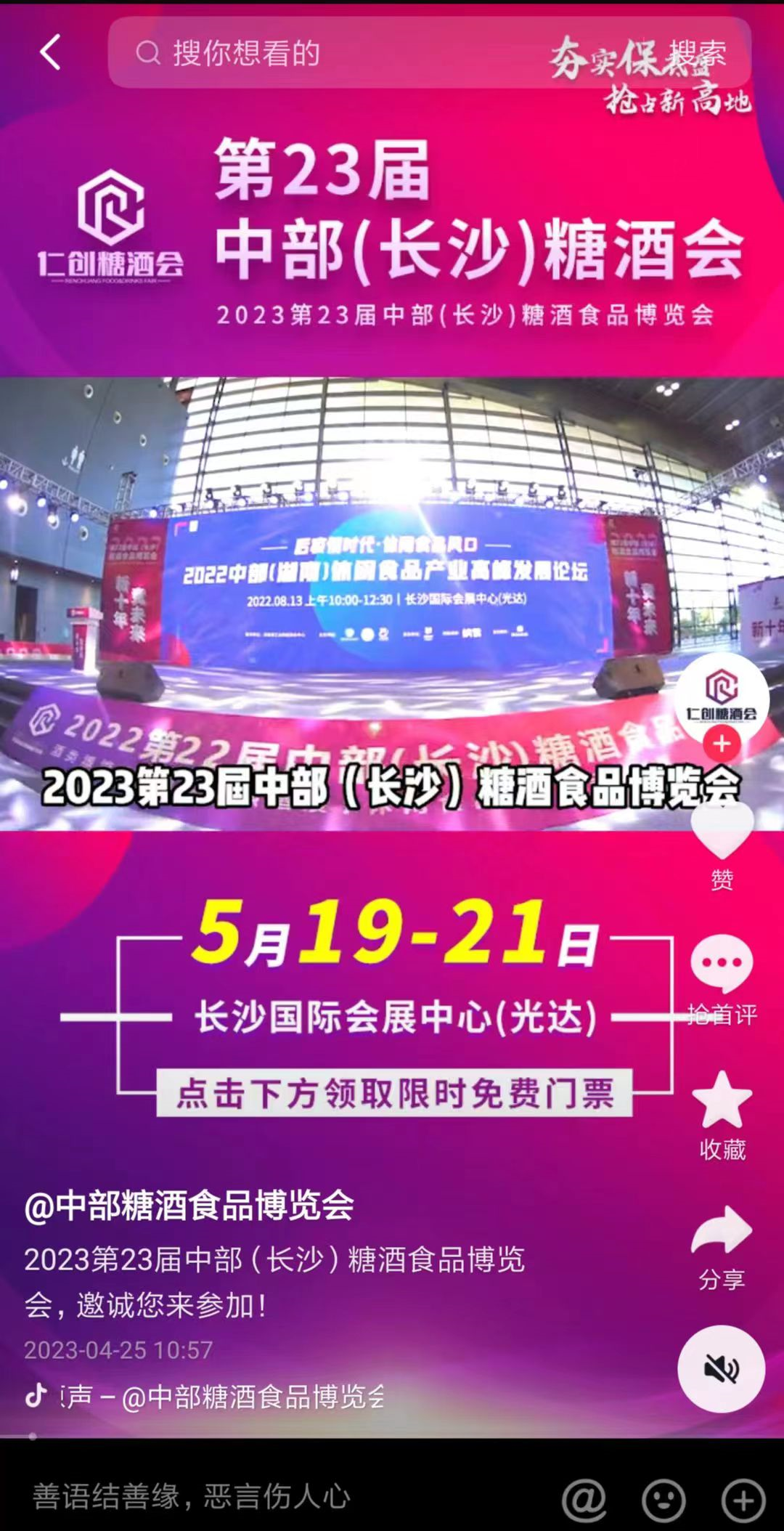 没有大投入,哪有好效果!2023第23届中部(长沙)糖酒食品博览会升级品牌传播战略,广告霸屏模式再度开启,抢占千万流量传播高地:抖音广告、公交站牌、户外LED大屏以及近百家行业垂直媒体联合全程深度报道,还有市县级市场宣传,360°千万级曝光,抢占视觉C位,触达人群广,传播效果准,一系列操作火力全开,助力您的品牌爆发式传播!