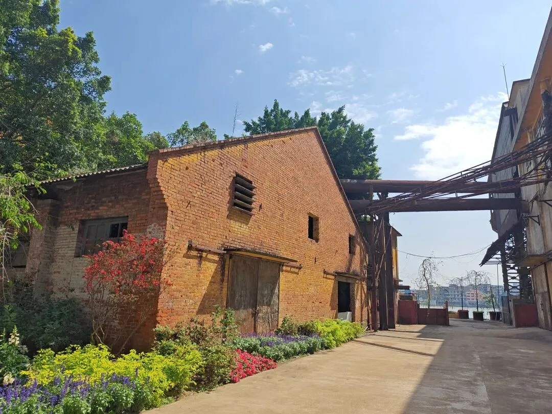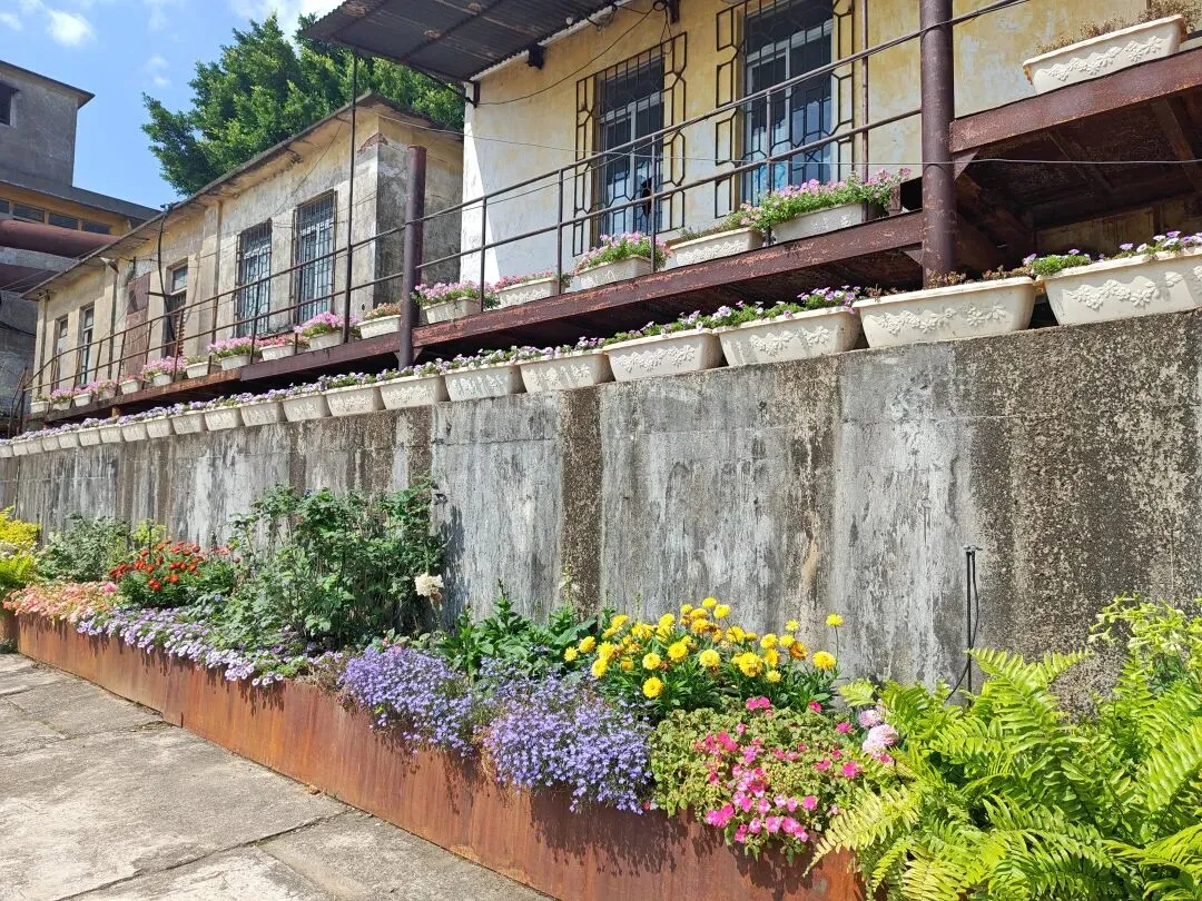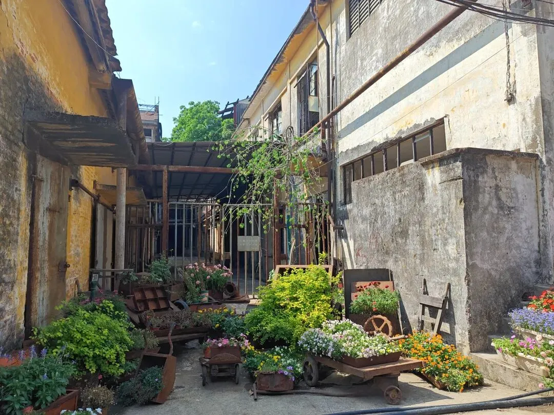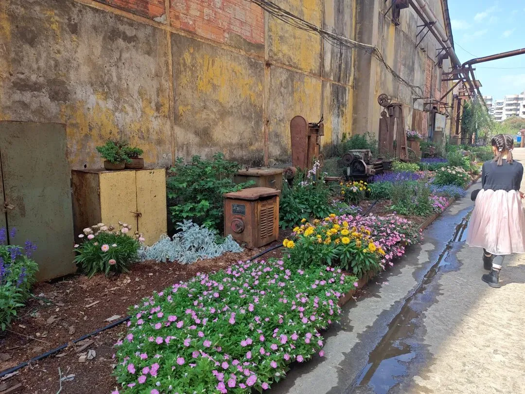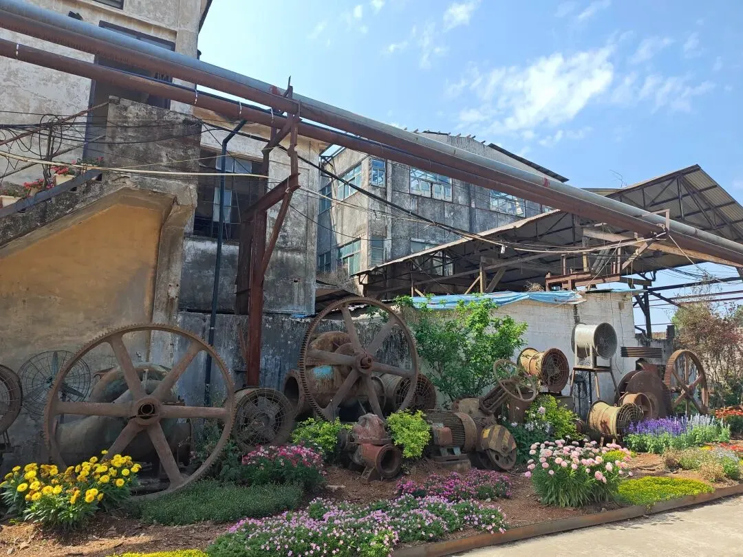 糖厂主打黄色系建筑,“压榨车间”倒和别的不一样,有几乎一整面都是方块蓝色玻璃窗户,顶上的红砖墙。有条“工业记忆长廊”上,堆满不再运转锈迹斑斑的车床与各式各样的机器,鲜花从机器的裂缝中、从齿轮的凹槽里生长,这幅景象是消逝凋零,也是新生绽放。生命生生不息。
