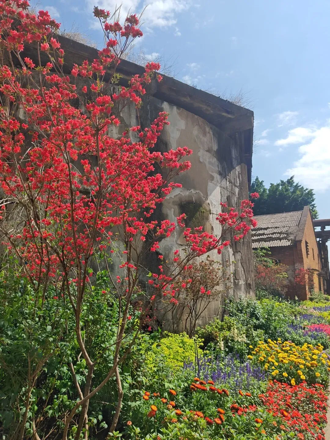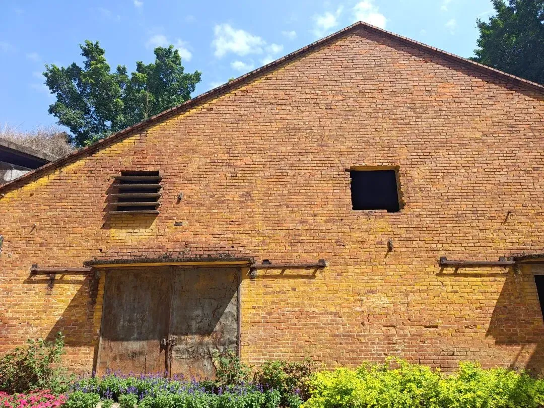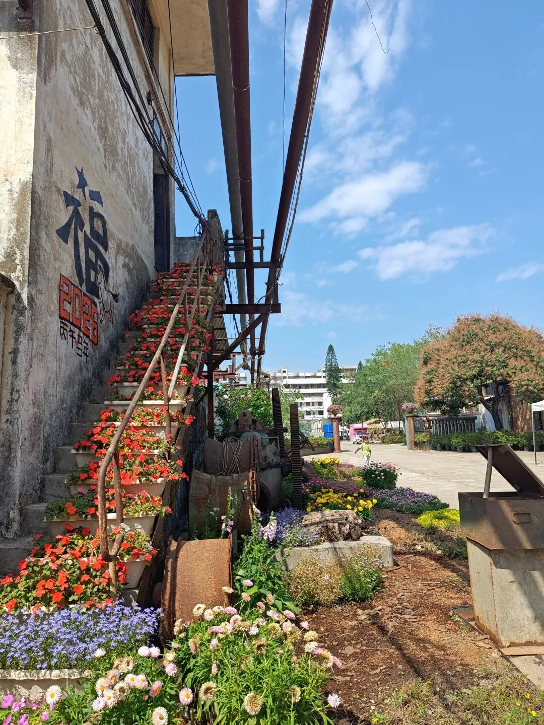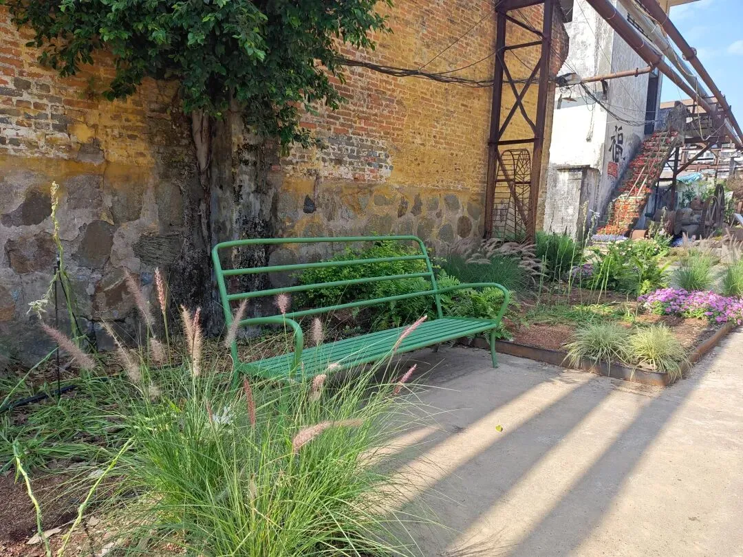 糖厂主打黄色系建筑,“压榨车间”倒和别的不一样,有几乎一整面都是方块蓝色玻璃窗户,顶上的红砖墙。有条“工业记忆长廊”上,堆满不再运转锈迹斑斑的车床与各式各样的机器,鲜花从机器的裂缝中、从齿轮的凹槽里生长,这幅景象是消逝凋零,也是新生绽放。生命生生不息。