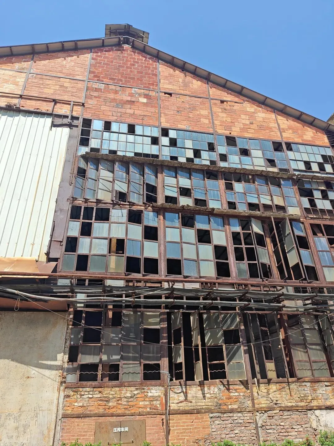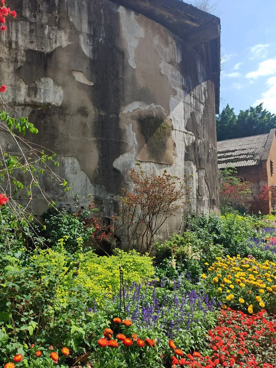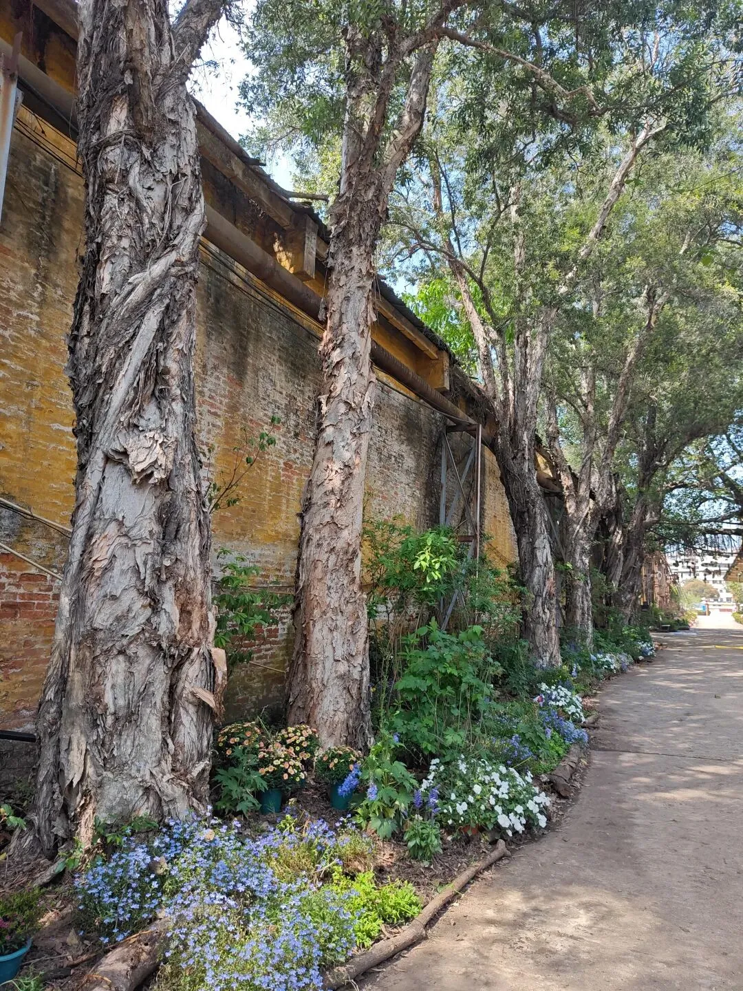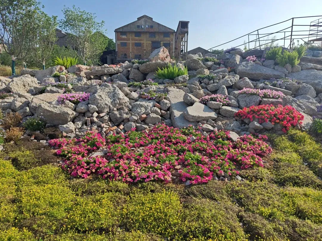 糖厂主打黄色系建筑,“压榨车间”倒和别的不一样,有几乎一整面都是方块蓝色玻璃窗户,顶上的红砖墙。有条“工业记忆长廊”上,堆满不再运转锈迹斑斑的车床与各式各样的机器,鲜花从机器的裂缝中、从齿轮的凹槽里生长,这幅景象是消逝凋零,也是新生绽放。生命生生不息。