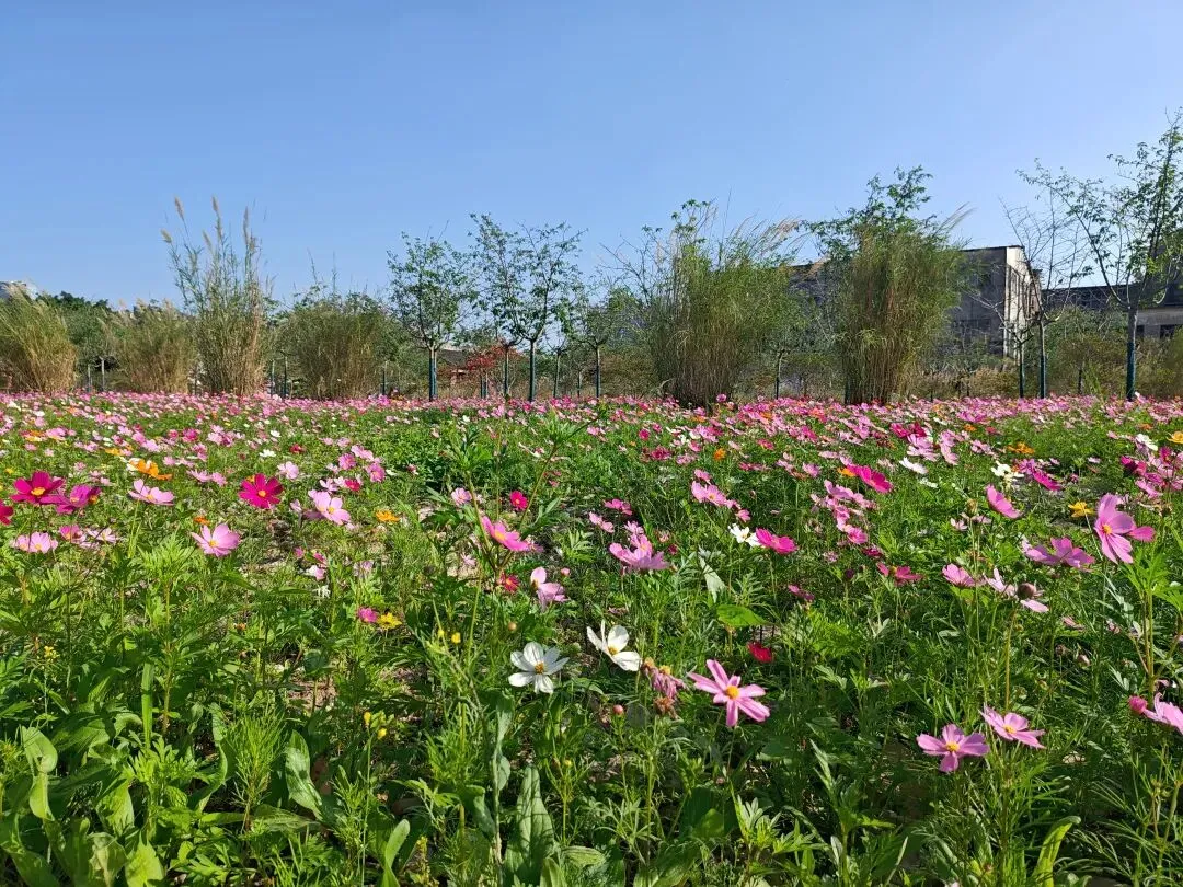 再往前走就能看到一大片各色秋英(秋英也叫波斯菊,经波斯传入我国),目测能有四百米操场那么宽的范围,估计不止,看到那么大范围的秋英,我一连喊了几个哇哇哇哇哇。有诗词云——“蓓蕾初成,扶蕖临波。秋英染金,梅映雪香”。