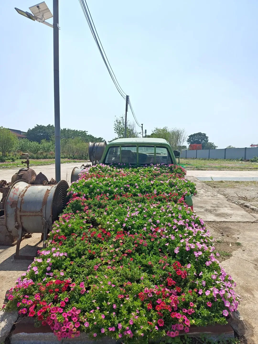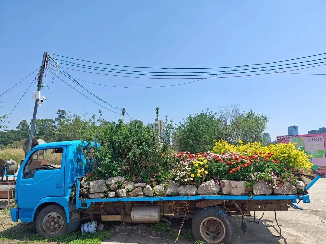 还有旁边两辆开往春天的卡车,一辆蓝色,一辆绿色。车身上都装满了花。绿色那辆主要装载了碧冬茄,别名矮牵牛,但和牵牛花关系不大,也不属于牵牛花。碧冬茄和秋英一样,都有很多花色,这辆车上的碧冬茄主打粉粉嫩嫩色系,浅粉、深粉都有。
