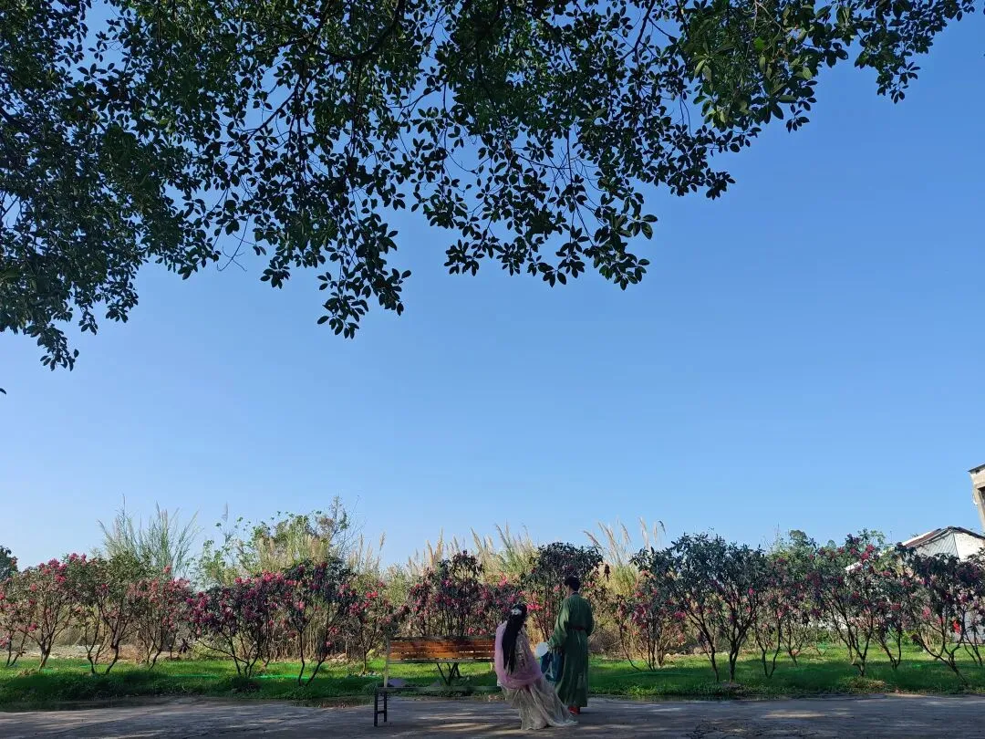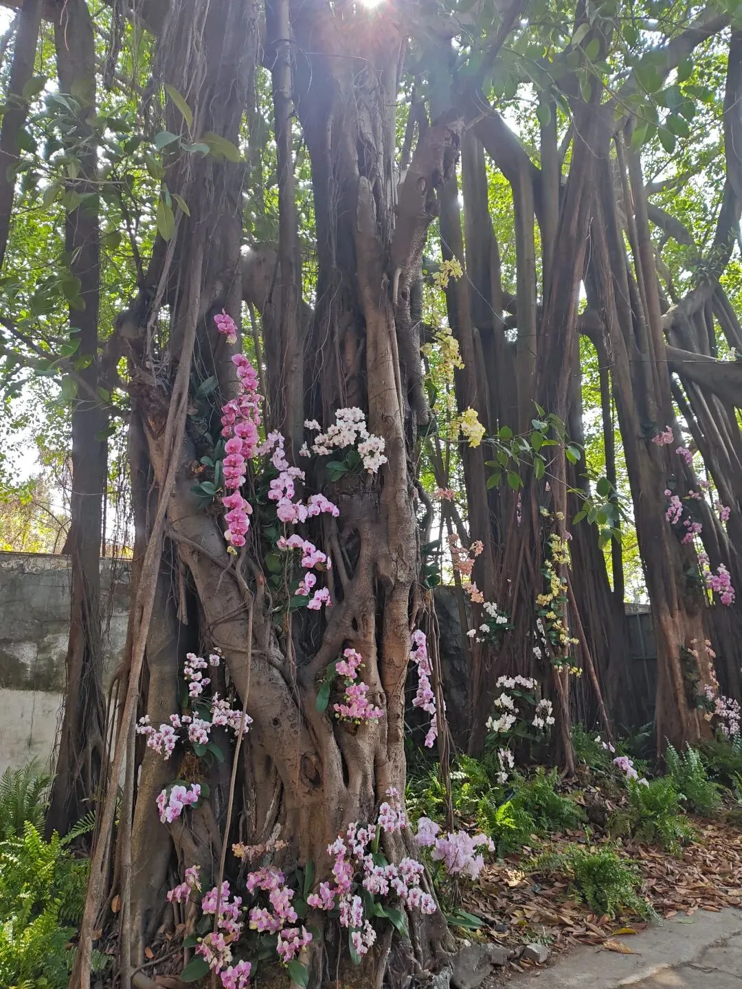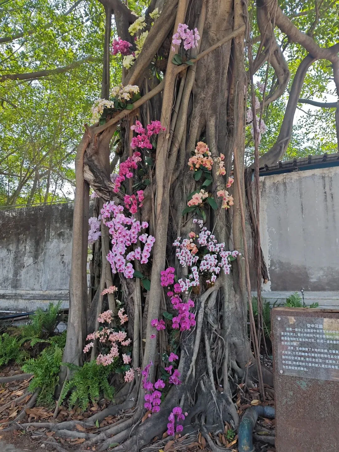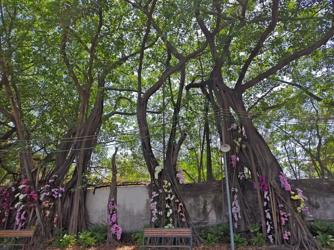 我们的椅子后边是一排树干粗壮根系发达的大榕树,榕树树干上被添进各色蝴蝶兰,这个场景布置得非常美!大多数人也会选择来这里拍照打卡。那对着古装的情侣也在蝴蝶兰边拍照,那位女士摆Pose,男士给她拍照,每拍完一次都说“很漂亮哦/这个角度也很漂亮哦”,听他说了几次后我终于忍不住转过头去看了看他们。
