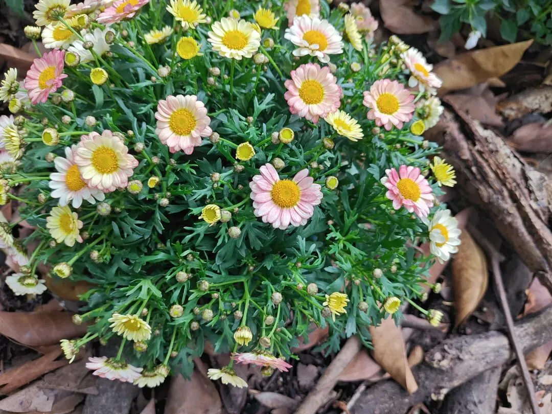 蓝色那辆则放了不同花色的蜡菊和绿植,蜡菊我曾养过一株似亮非亮粉色的,花猛猛开,开谢了一轮又继续开新的一轮,这株蜡菊从冬到夏大概养了有七个月左右,最后死于夏季三十七八度的高温,如果我没猜错应该是这样的。
