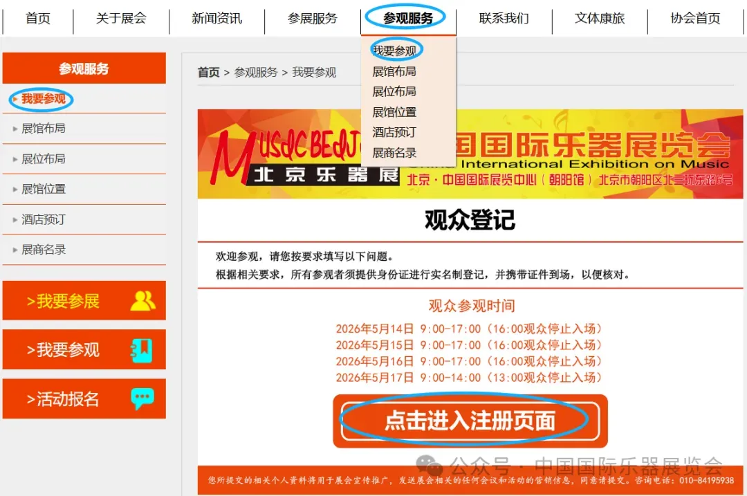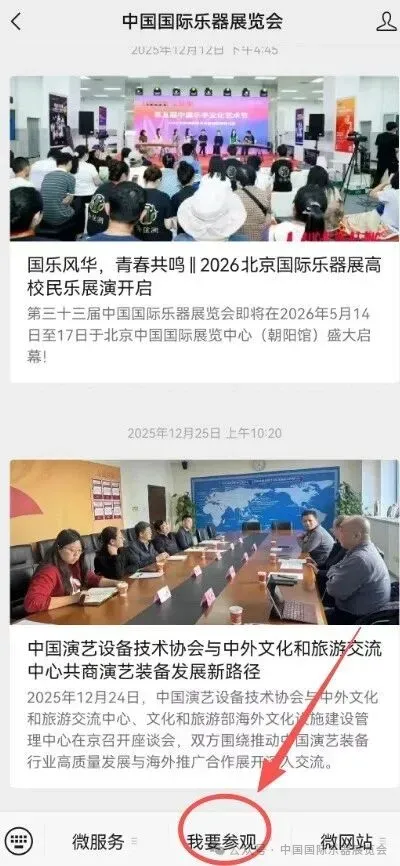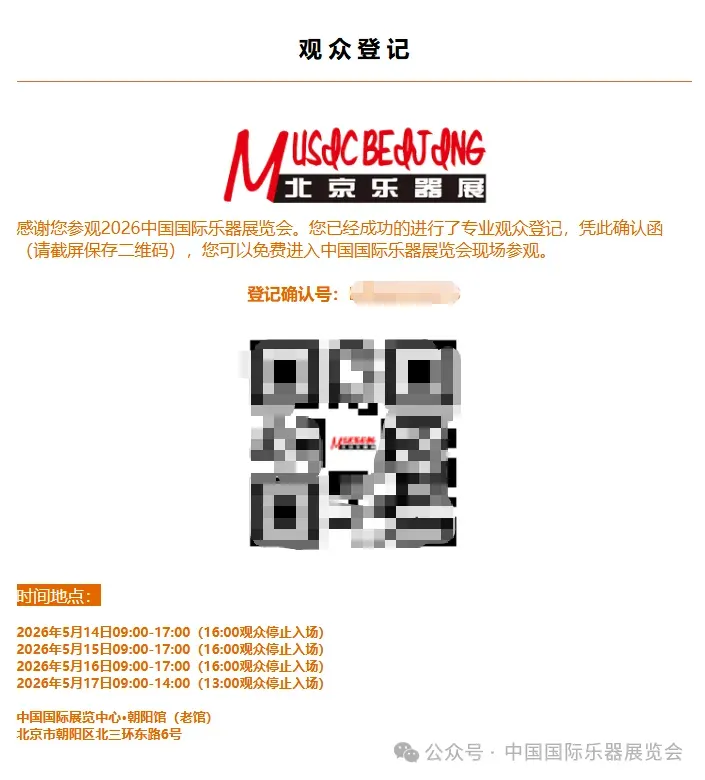 关注官方微信公众号(中国国际乐器展览会),进入公众号后,点击“我要参观”,按要求填写个人信息;提交后,请截屏保留二维码页面,凭二维码免费参观。