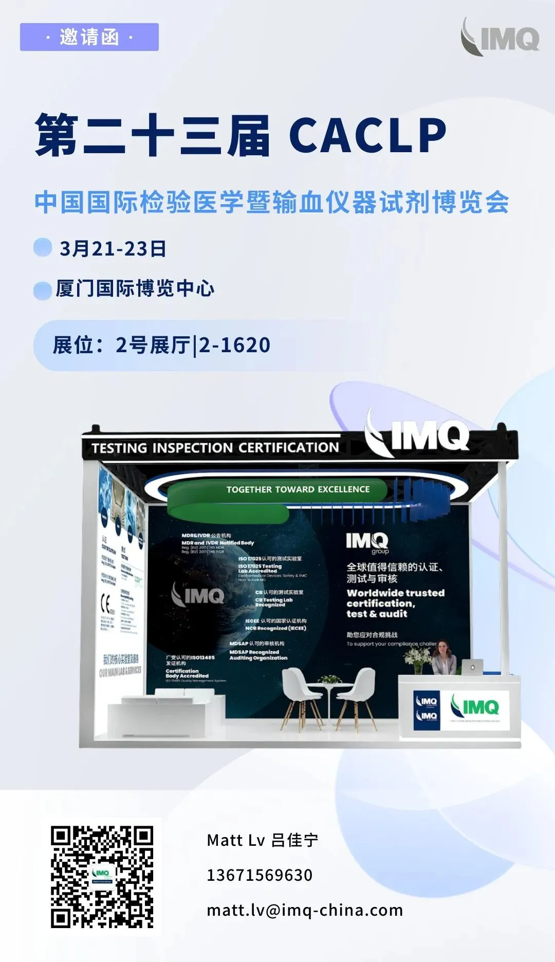 2026年3月21-23日,意大利官方测试、检验和认证机构 IMQ (NB 0051),将继续亮相“第二十三届中国国际检验医学暨输血仪器试剂博览会”,与行业同仁共探IVD器械出海之道。