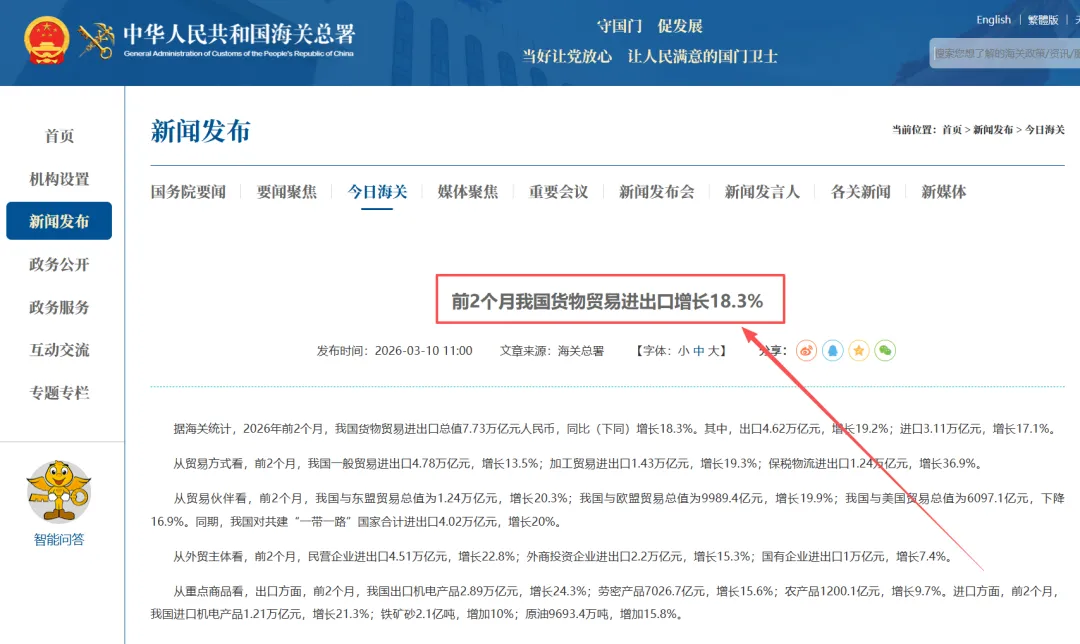 另外,3月10日,海关总署对外公布外贸数据,2026年前2个月,我国货物贸易进出口总值7.73万亿元人民币,同比增长18.3%。