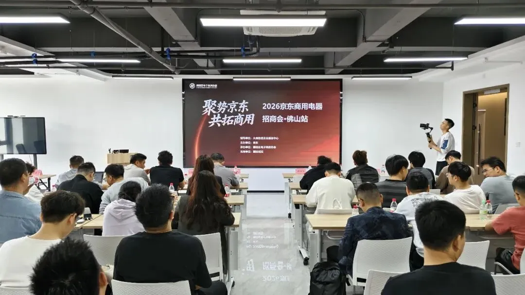3月17日下午,由大良街道企业服务中心指导,京东携手顺德区电子商务协会主办的“2026年京东商用电器招商会·佛山站”在大良顺控城投云悦荟举行。本次招商会以“聚势京东·共拓商用”为主题,汇聚平台负责人及优秀商家代表近百人,共同探讨商用电器行业趋势与电商发展新机遇。