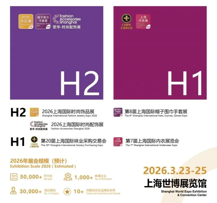 本届展会将继续携手第20届上海国际袜业采购交易会CHPE、第2届上海国际时尚饰品展FJE、第7届上海国际内衣展SUE这3个上海国际时尚配饰展中的系列展同期召开。2026年展会总面积将达到5万平米,2大展馆汇聚近900家展商,一站式打通帽子、帽饰、围巾、丝巾、披肩、手套、发饰、手饰、项饰、耳饰、袜子等多个行业及产业链,届时本届展会将用多样化的时尚细分市场进行联动,共同打造了一场规模宏大内容丰富的流行配饰行业盛宴。