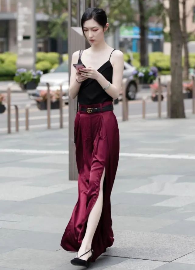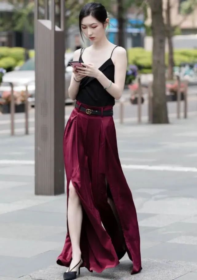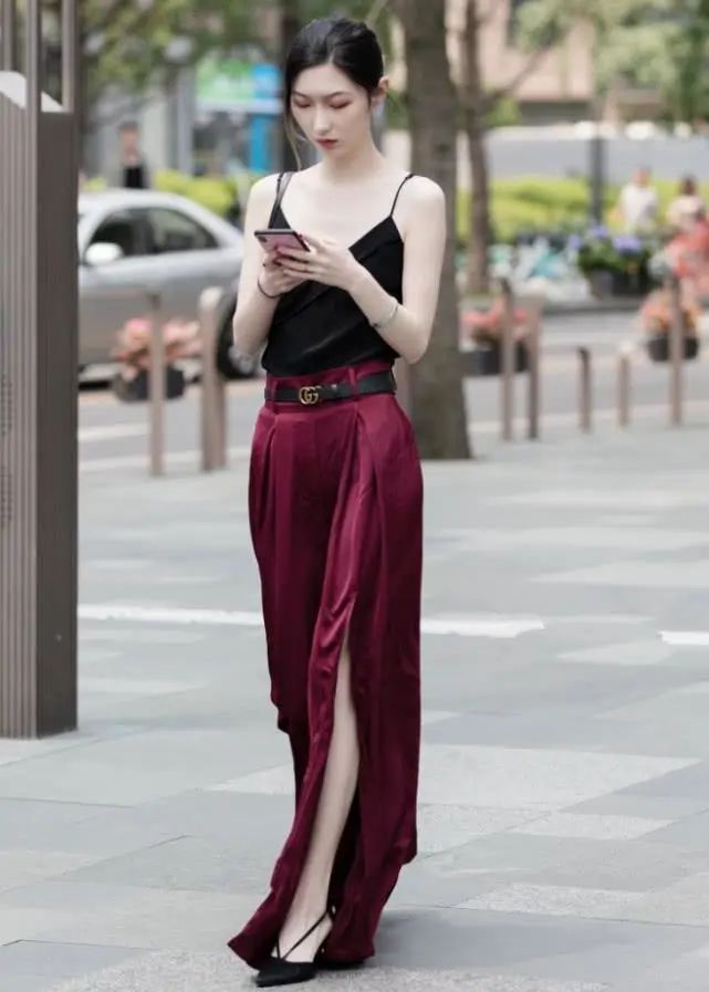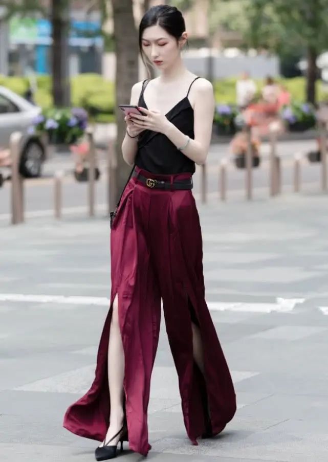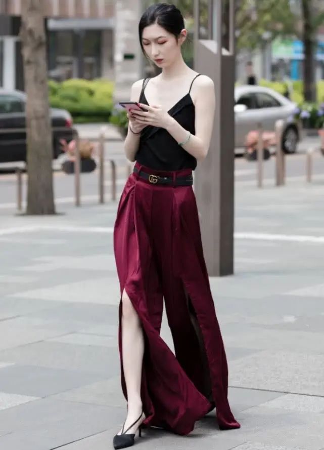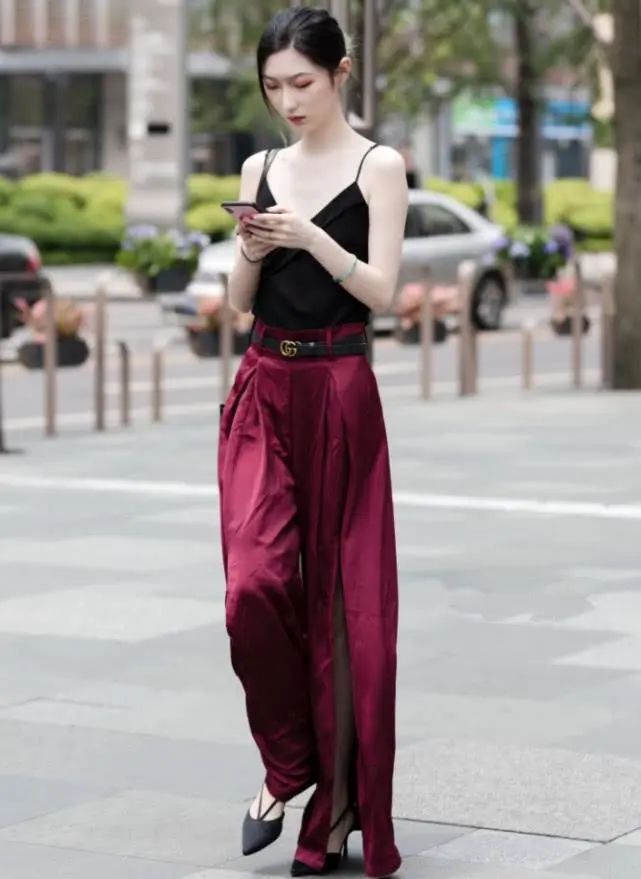 小姐姐的整体穿着是很有时尚个性的,黑色的吊带衫搭配上宽松又开叉的“红酒裤”,红与黑的色彩碰撞,凸显出几分端庄典雅的气质。高开叉设计,展现出完美的腿部线条,脚踩黑色的尖头高跟鞋,将吊带衫扎进裤子,轻松提高了腰线,修饰了身材比例,让小姐姐看起来更加高挑!