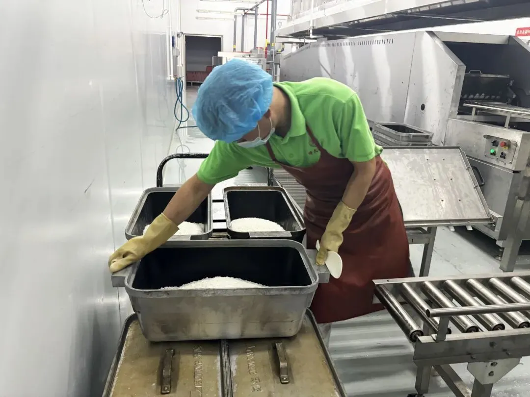 走进学生食堂集中加工中心米饭生产线车间,宽敞洁净的制作环境、“全副武装”的工作人员,就连空气中也弥漫着浓郁的饭香味,因为在这里的每一粒大米正经历着“涅槃重生”的考验。