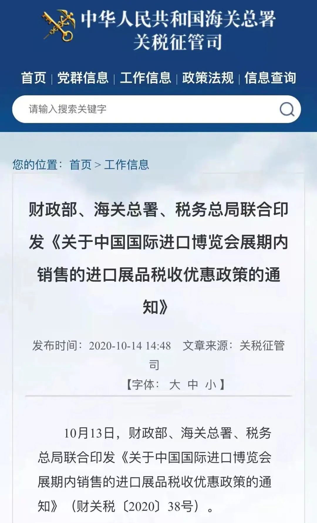 财政部、海关总署、国家税务总局三部门联合发布《关于中国国际进口博览会展期内销售的进口展品税收优惠政策的通知》(财关税【2020】38号)。