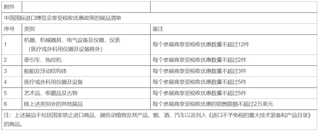 对进博会展期内销售的合理数量的进口展品免征进口关税、进口环节增值税和消费税。不包括国家禁止进口商品,濒危动植物及其产品,烟、酒、汽车以及列入《进口不予免税的重大技术装备和产品目录》的商品。