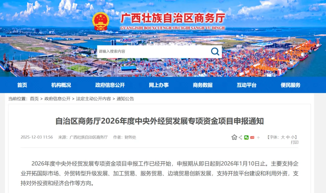 另自治区商务厅2026年度中央外经贸发展专项资金项目申报已于2026年1月10日结束,详情请点击查看: