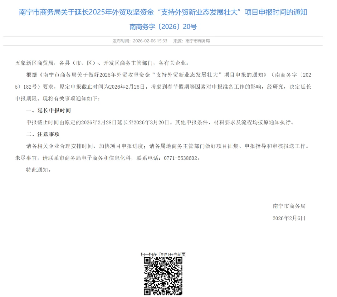 《南宁市商务局关于延长2025年外贸攻坚资金“支持外贸新业态发展壮大”项目申报时间的通知》