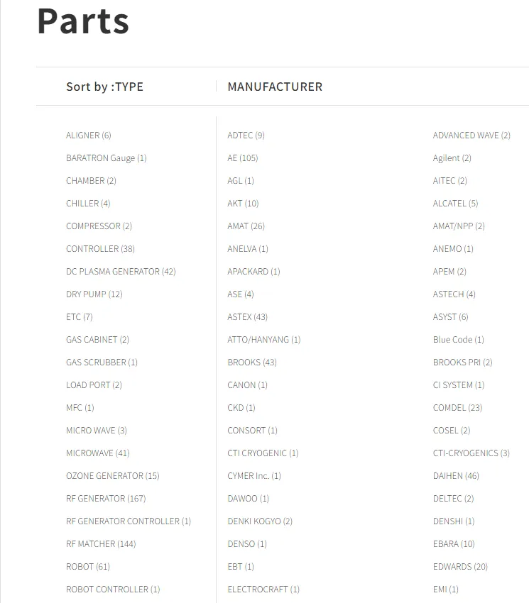 通过持续采购,CIS Corporation库存了大量的各种备件,如射频零件,OEM零件,泵和前端设备中使用的机器人,以满足客户及时需求。