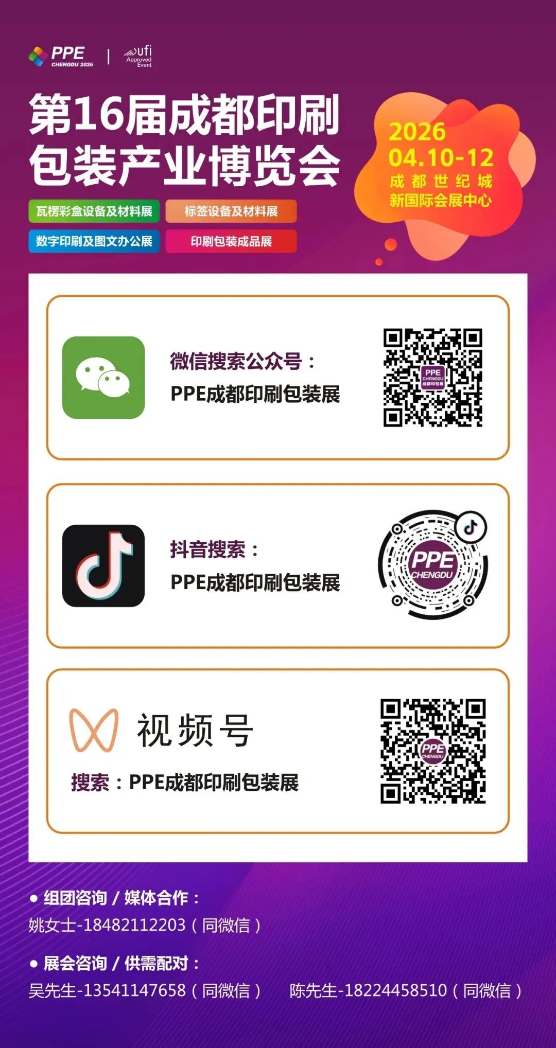 2026年4月10-12日,成都世纪城新国际会展中心,第16届成都印刷包装产业博览会(PPE 2026) 携全面升级之势重磅来袭!以15000+㎡展览面积、400+家行业优质展商、25000+名精准专业观众,打造集“商贸对接、技术交流、趋势洞察、品牌展示”于一体的西部印包行业“全景式产业盛宴”,助力印包企业高效链接资源、把握趋势,在2026年实现新增长!