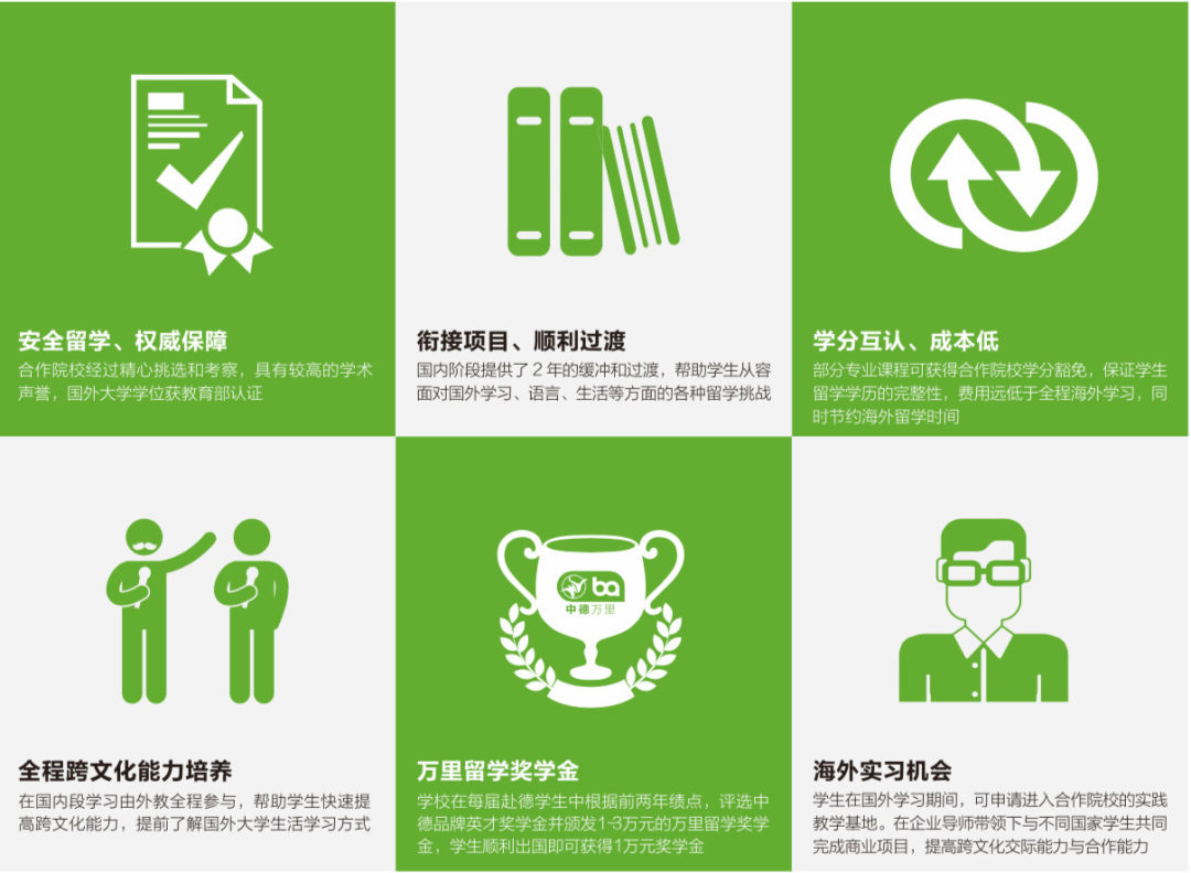 学生第一学年、第二学年在浙江万里学院学习,第三学年、第四学年在国外合作大学学习,毕业可同时获得浙江万里学院本科学历证书、学士学位证书和国外大学学士学位证书。