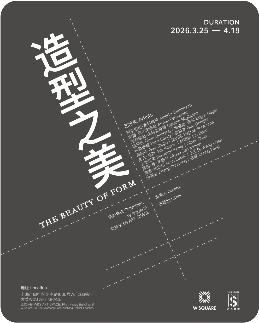 “造型之美” ![]() 《造型之美》 The Beauty of Form 艺术家 Artists 阿尔伯托·贾科梅蒂Alberto Giacometti 阿曼·费尔南德斯 Arman Fernandez 克劳迪奥·米利亚里诺Claudio Migliarino 陈庆庆 Chen Qingqing|埃德加·德加 Edgar Degas 水果硬糖 Hard Candy|郭东来 Guo Donglai 高树杰 Gao Shujie|空山基 Hajime Sorayama 杰夫·昆斯 Jeff Koons |林博裕 Lin Boyu 小池正典 Masanori Koike|Oliver Chan 奥田·圣·米格尔 Okuda San Miguel 瑞恩·拉巴尔 Ryan LaBar|王立伟 Wang Liwei 张春迎 Zhang Chunying|张峰 Zhang Feng 出品人 Producer 王丽欣 Litchi 展期 Duration 2026.3.25-2026.4.19 主办单位 Organizers W SQUARE 索美 W&S ARTSPACE 地址 Location 上海市闵行区吴中路1686号W广场B栋1F 索美W&S ART SPACE SUOMEI W&S ART SPACE, First Floor, Building B,W Square, No.1686 Wuzhong Road, Minhang District, Shanghai —作品预览—
