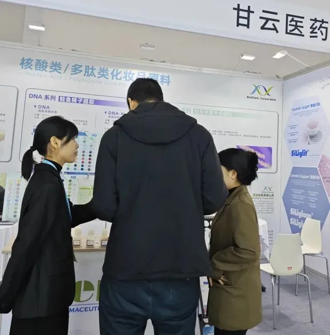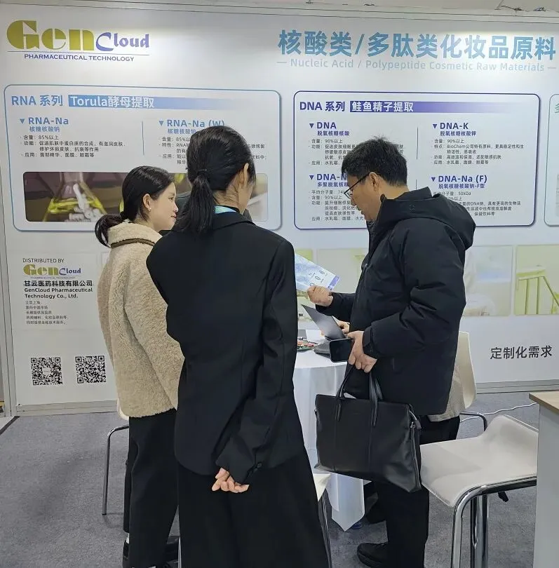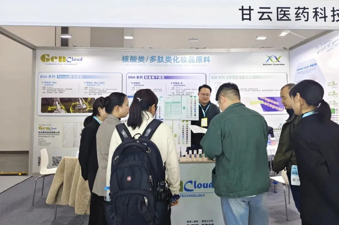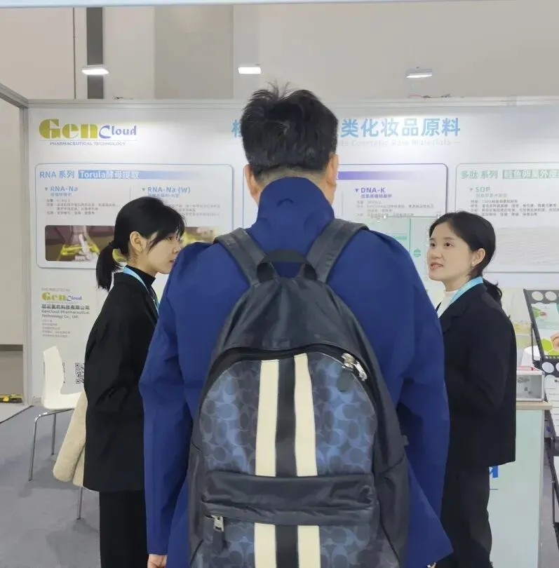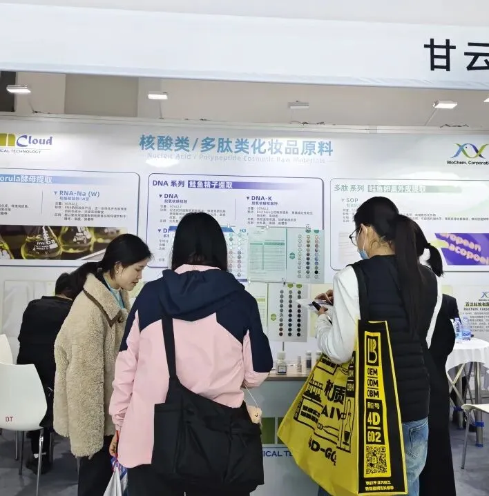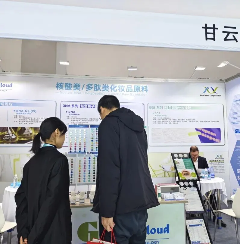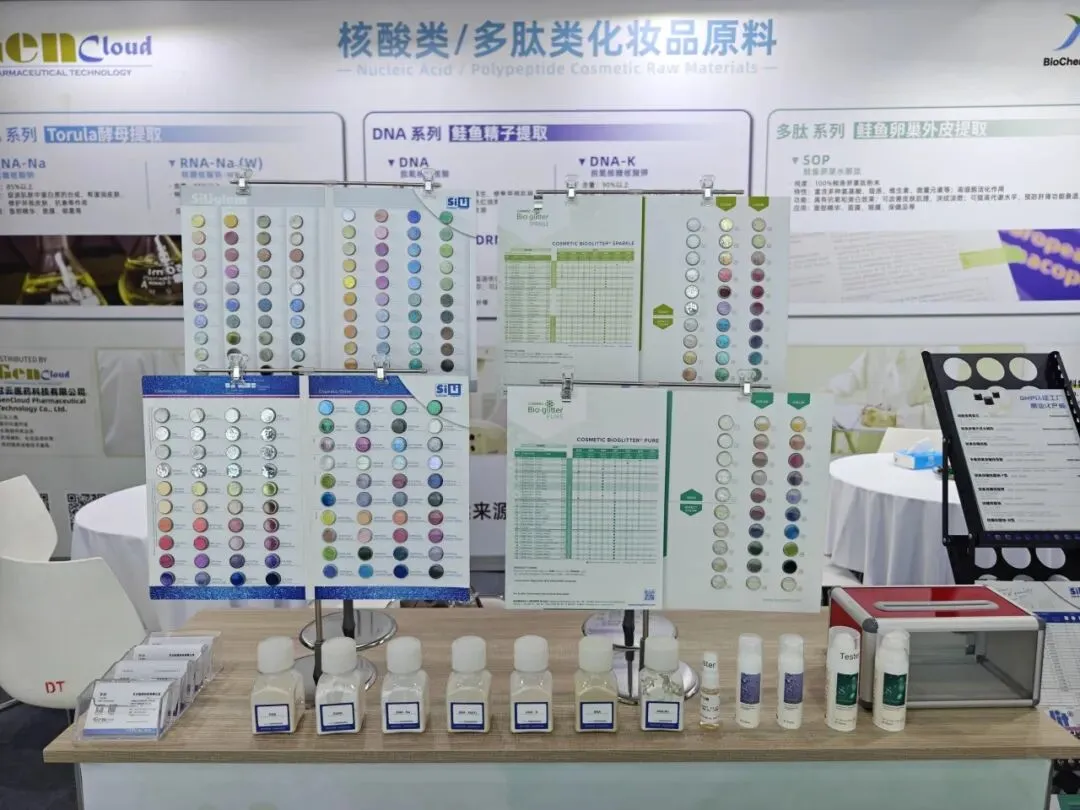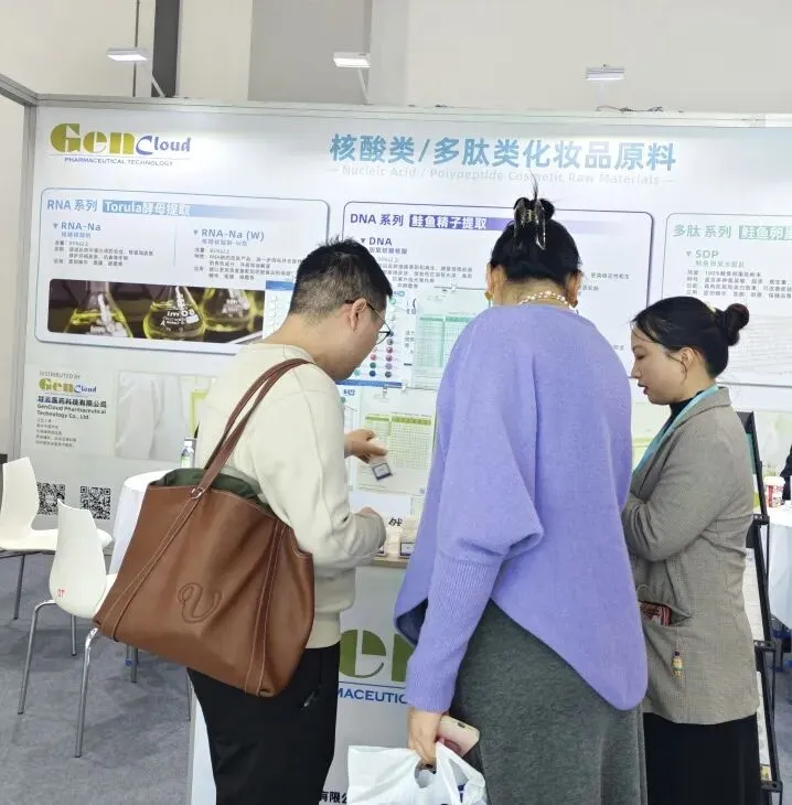 现场团队依旧以专业细致的服务,针对鲑鱼提取PDRN、酵母提取RNA、鲑鱼卵巢外皮水解肽SOP及可生物降解金葱粉等核心原料,深度解析产品优势、适配品类与长期供货保障,高效推进合作对接。